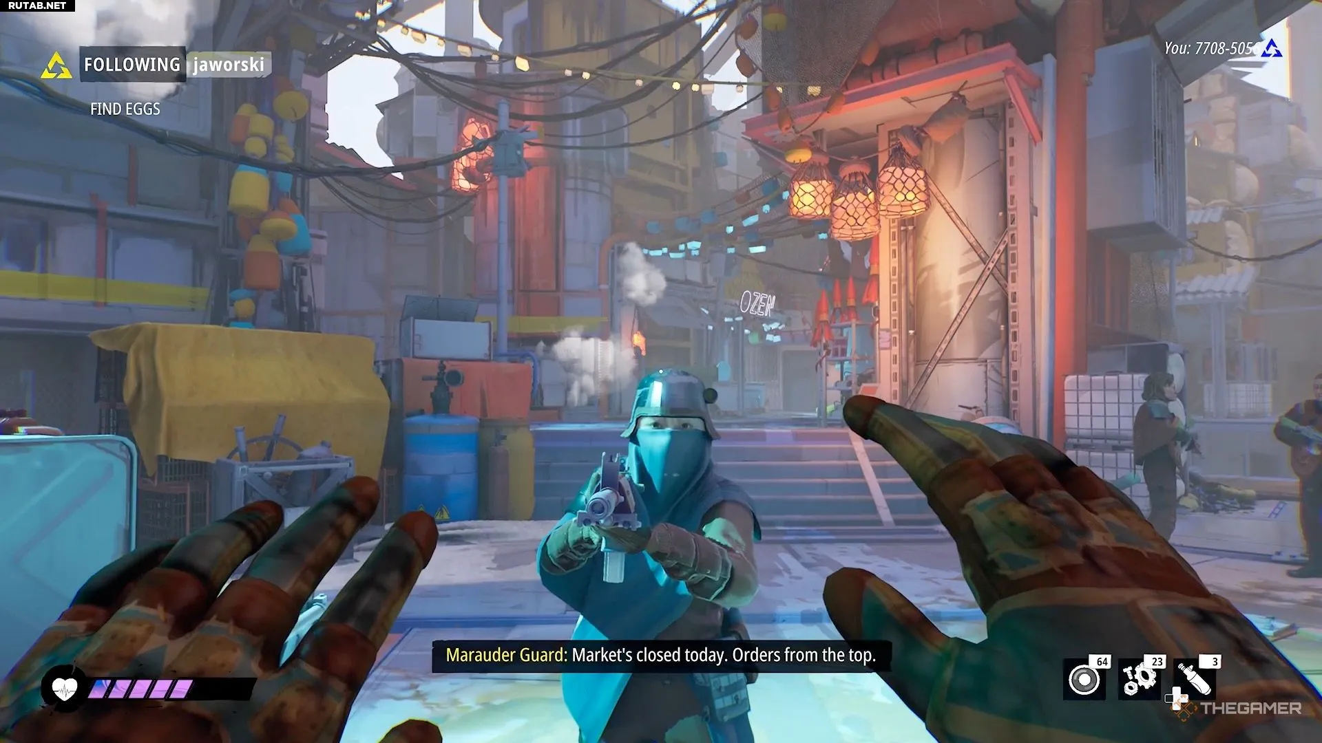 Во время второго визита в Рекландию вас остановит на воротах охранник-мародер. Он либо пропустит вас автоматически, либо подойдет Никс и потребует, чтобы вас впустили.