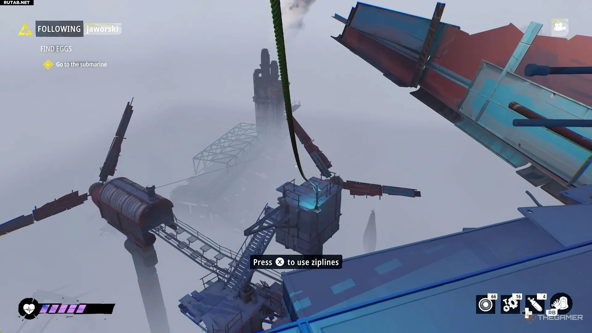После этого поднимитесь еще по нескольким лестницам на вершину турбины. Оттуда воспользуйтесь зиплайном, чтобы спуститься вниз.