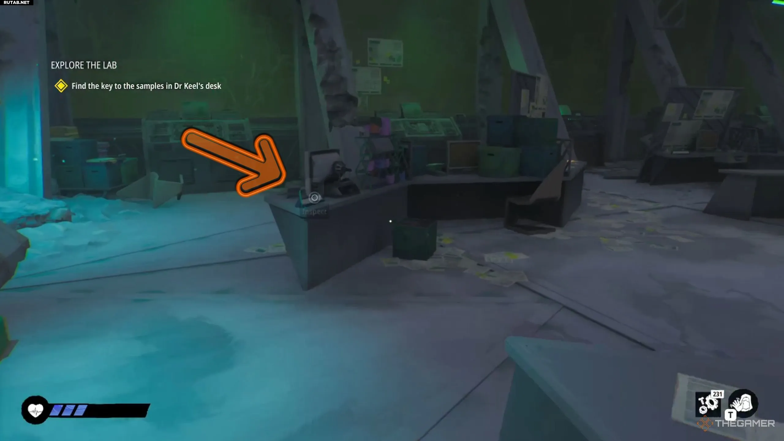 Во время диалогов в лаборатории Эйла позовёт вас посмотреть вместе с ней. В этот момент взаимодействуйте с предметом на столе слева от неё — это даст информацию о хранилище. Нахе будет рядом с этим хранилищем, но ей понадобится ключ из стола доктора Кила. Этот стол находится ближе всего к камере эксперимента справа.