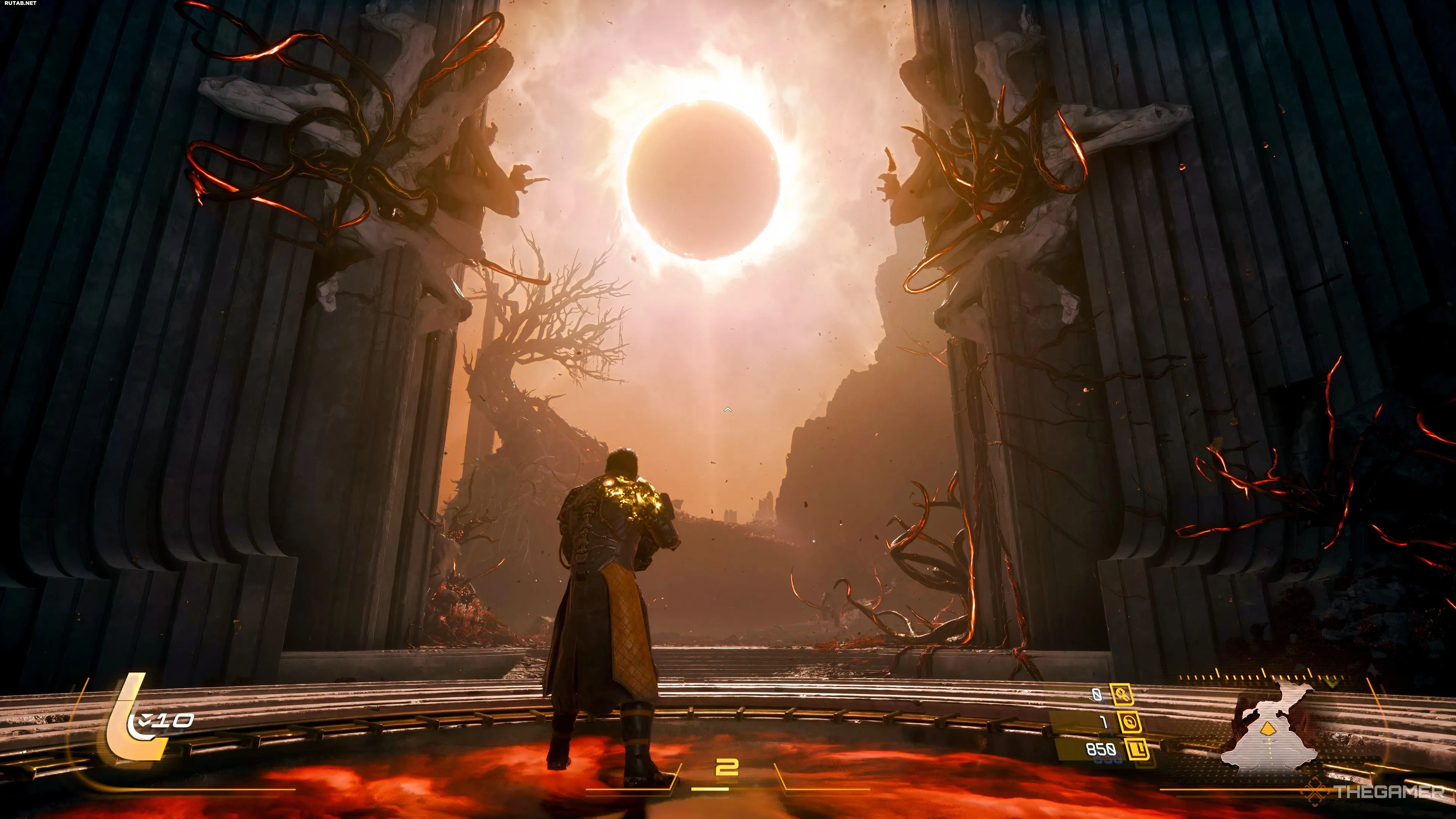Во время фазы затмения на уровне крайне важно переключиться с поглощения снарядов щитом на уклонение от них. Если поглотить порчу, вы значительно уменьшите своё максимальное здоровье со временем, и надёжного способа очистить её не будет.