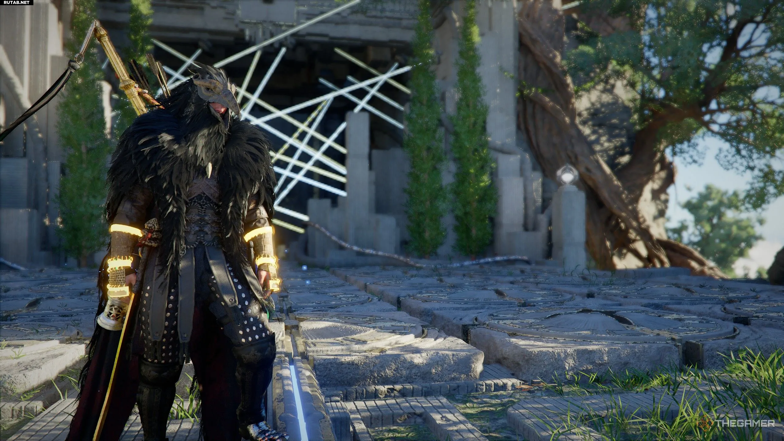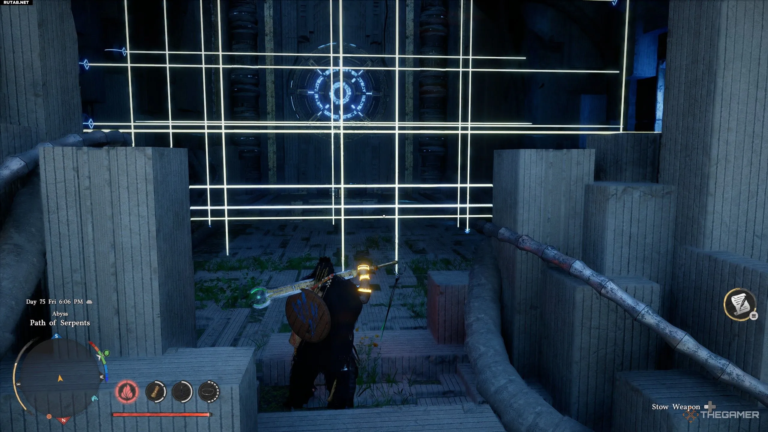 Увидеть, в какую сторону потечет энергия, можно с помощью способности «Отражения». Она покажет путь каждой плиты желтым цветом, а когда эти пути активны, они будут светиться синим. Головоломка состоит из пяти колонок, в каждой из которых по пять подвижных плит. Хотя это кажется большим количеством, к счастью, для решения нужно переместить лишь несколько. Также рекомендую решать головоломку ночью, так как днем пути энергии, когда они неактивны, могут быть плохо видны.