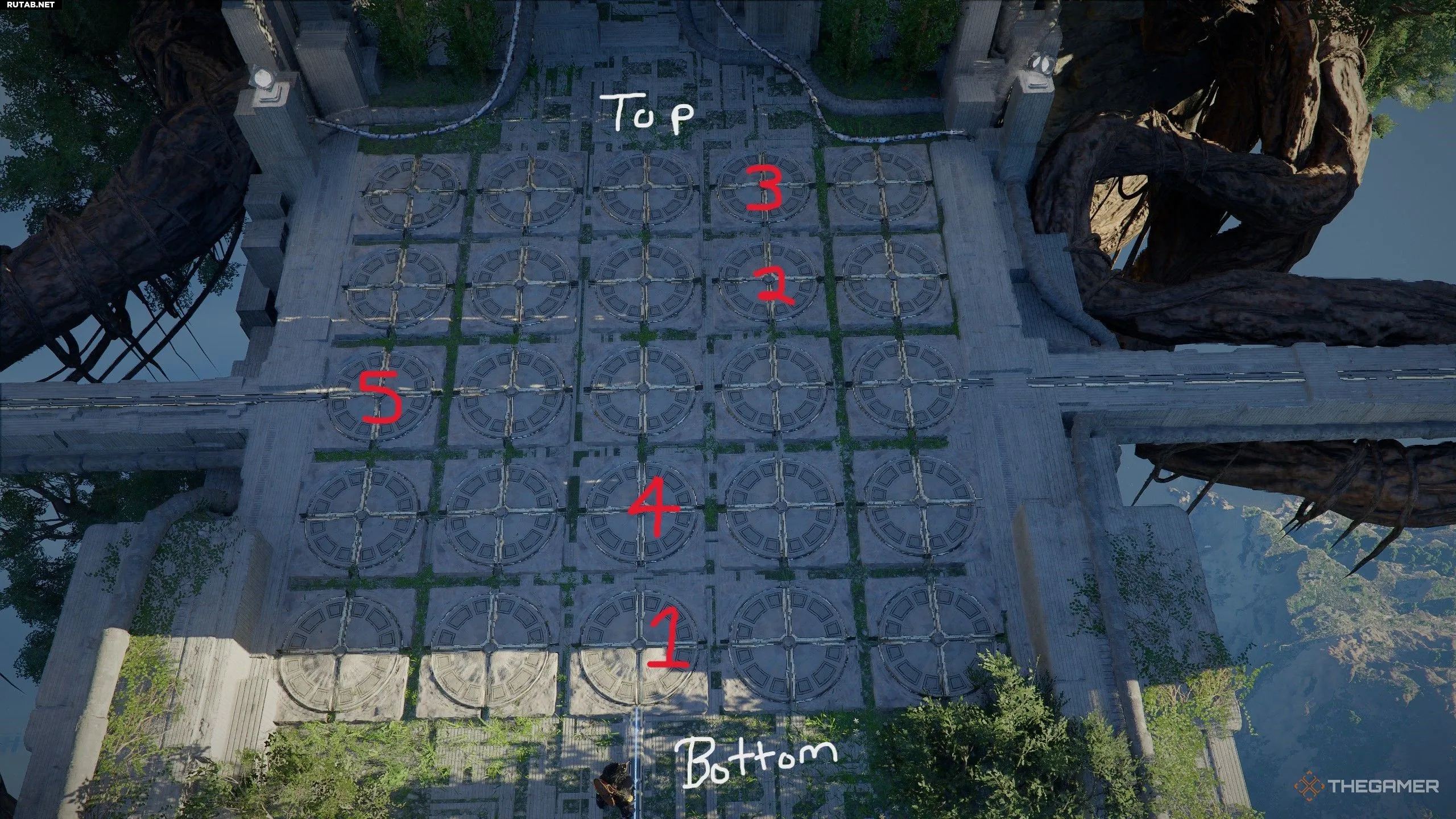Для ясности ума пронумеруем колонки слева направо как Колонка 1, 2, 3, 4 и 5. На изображении ниже плиты, с которыми нужно взаимодействовать, пронумерованы в порядке их рассмотрения, чтобы вам было проще следовать.