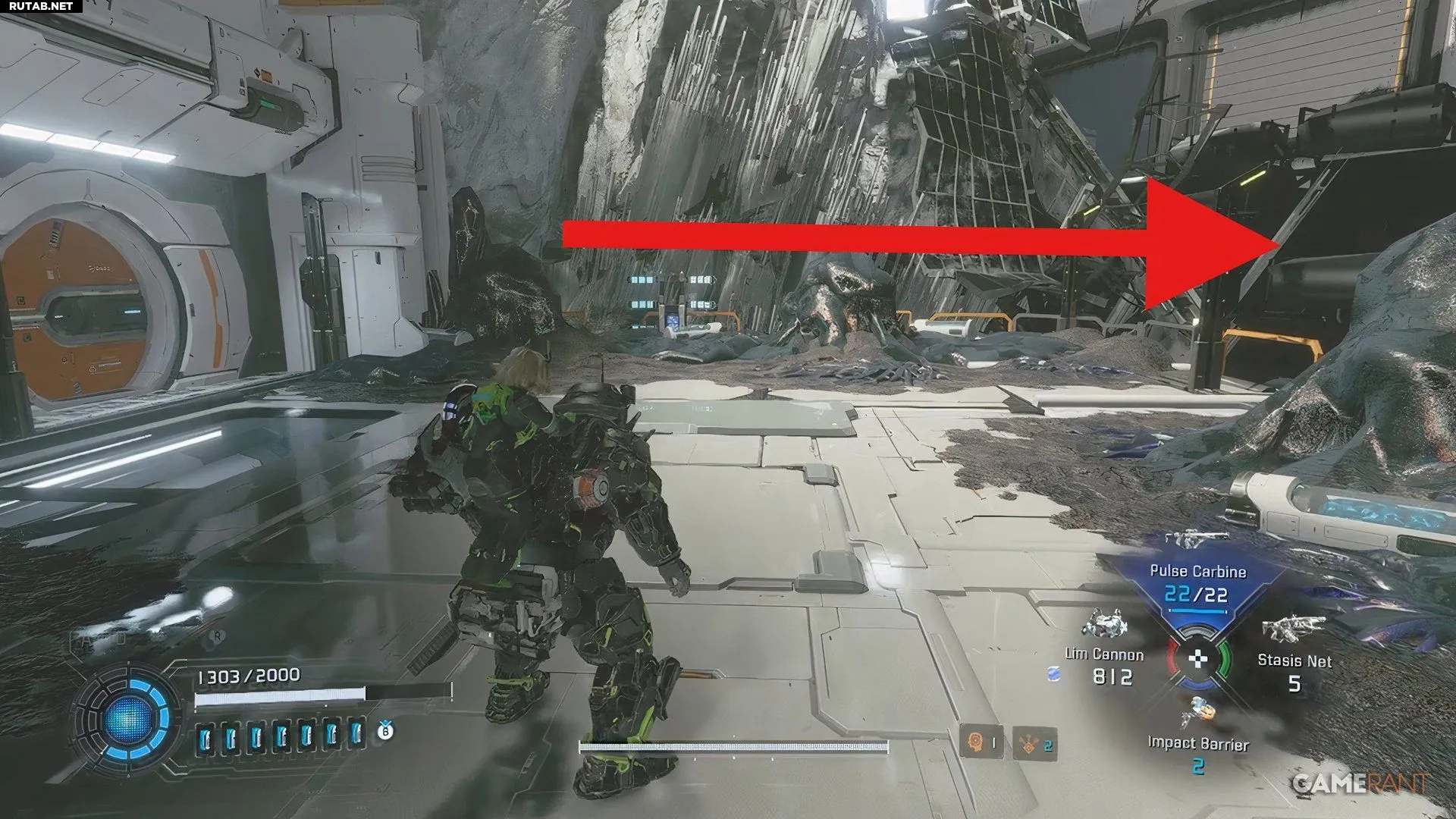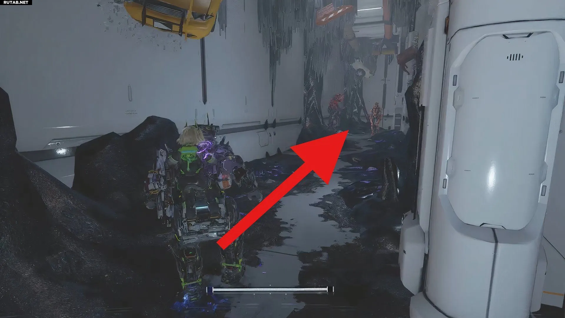 - Поверните направо у станции, чтобы увидеть парящую луна-нить над мусором. Продолжайте двигаться вправо, чтобы найти путь к дверному проему, ведущему «наружу».