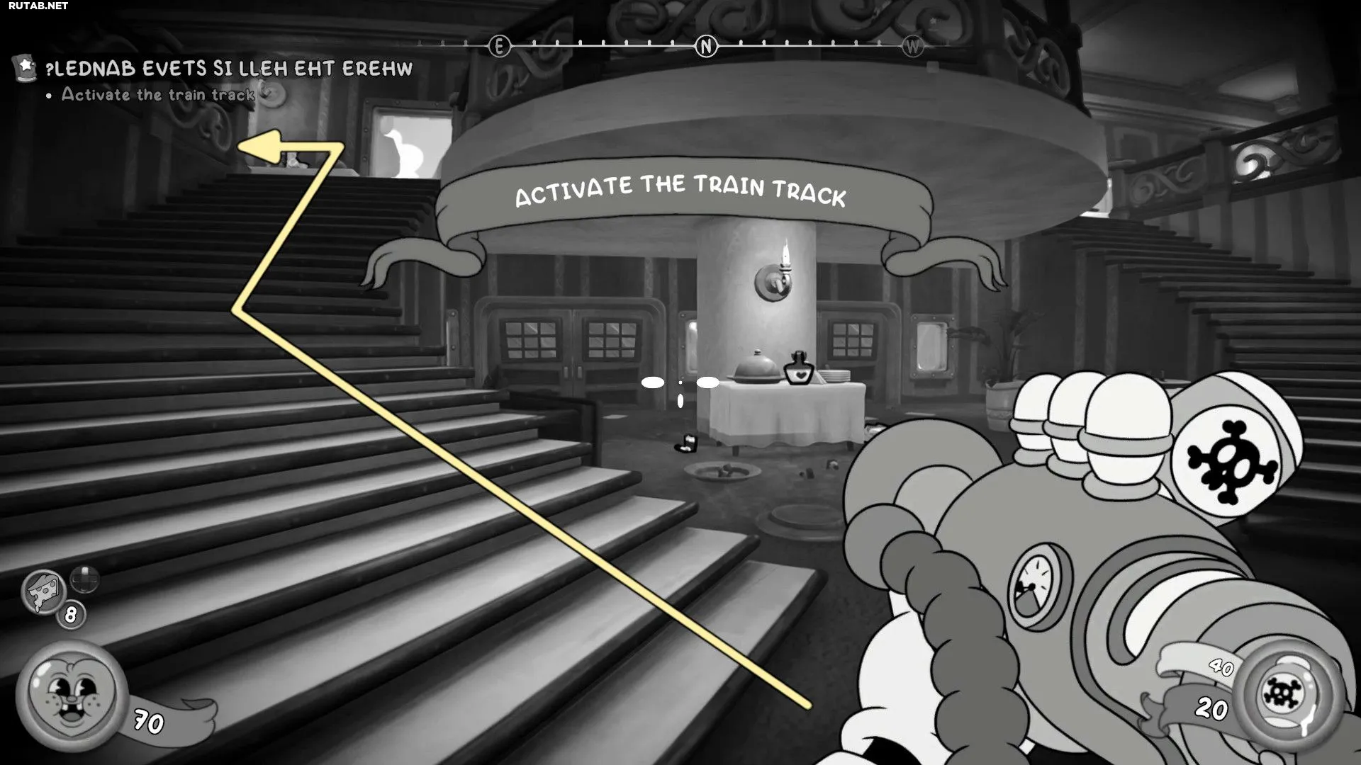 Переключите рычаг внизу и провалитесь в дыру в полу, чтобы оказаться на улице рядом с железнодорожными путями. Выстрелите в мишень над путями рядом с большой парящей рукой со стрелкой, чтобы активировать их.