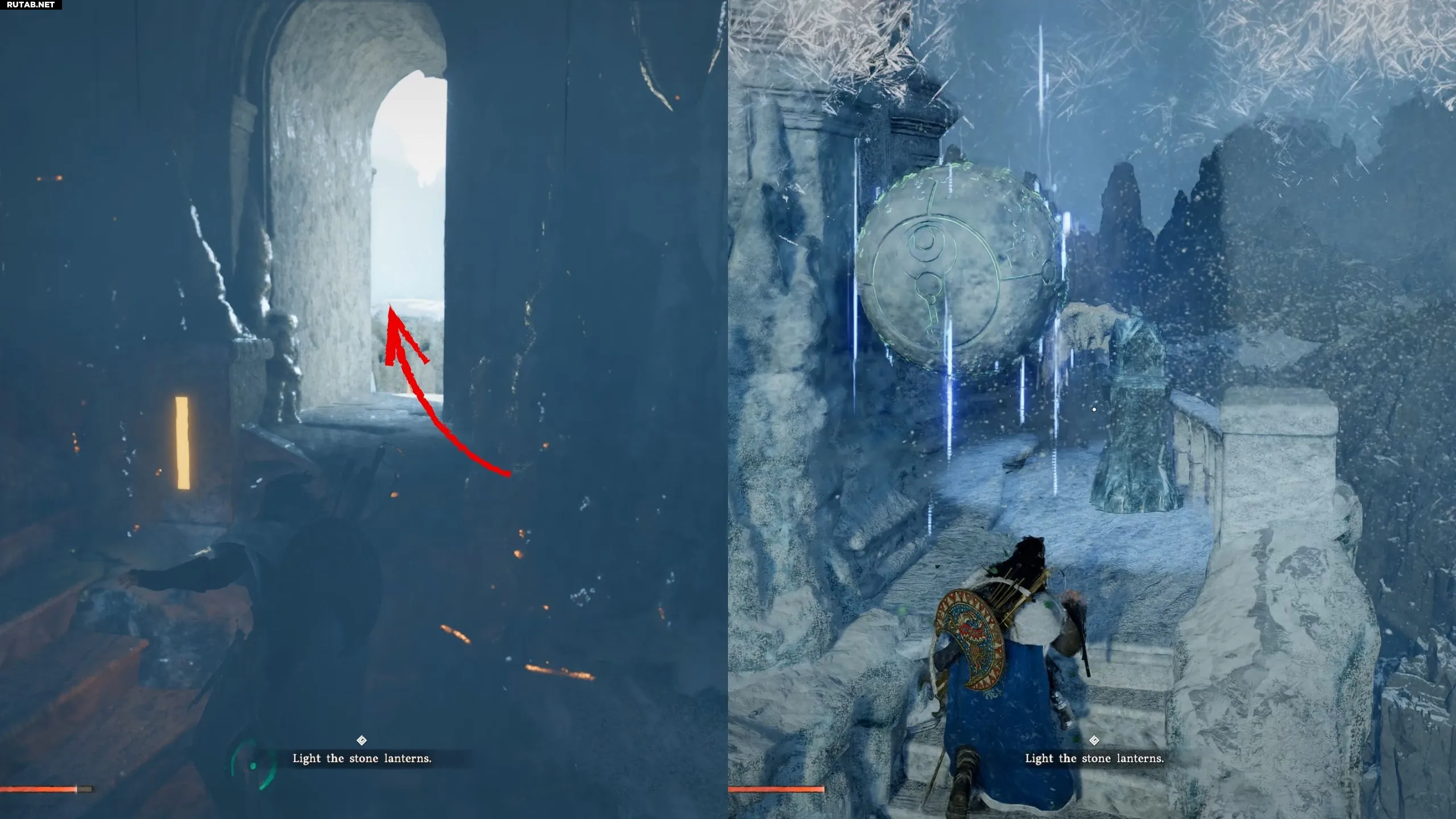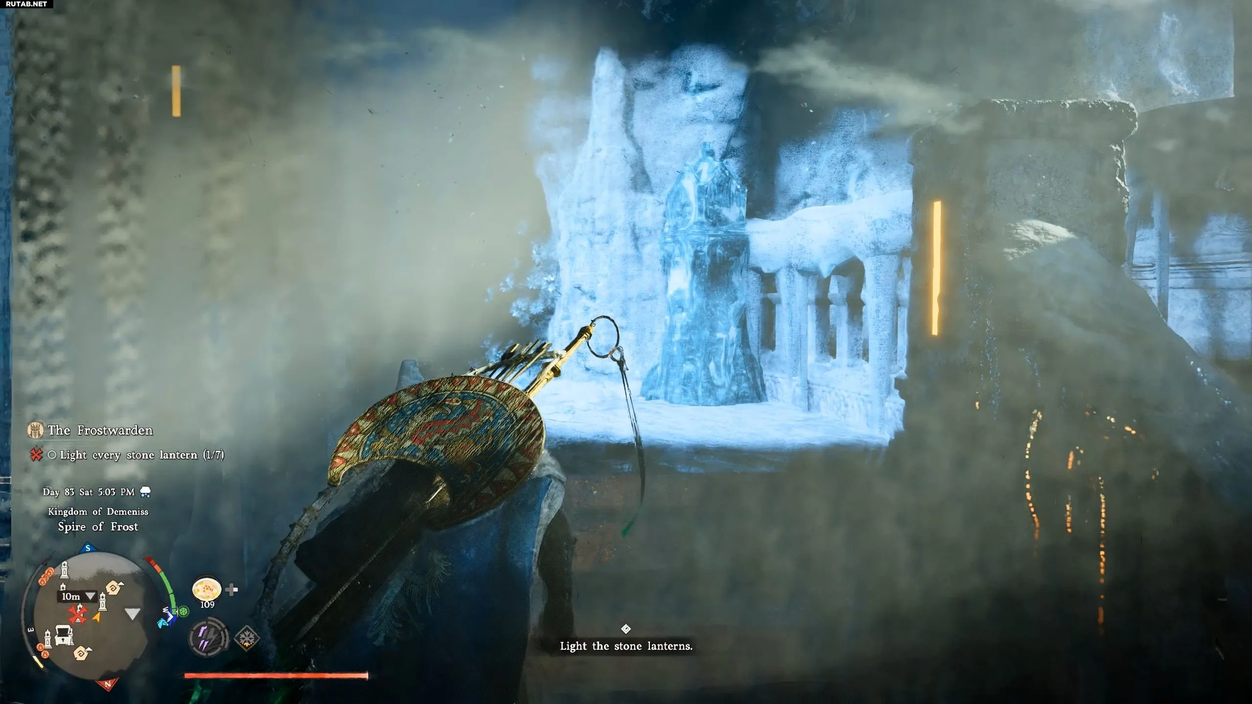 Следуйте за маркером квеста, пока не доберетесь до первого замерзшего каменного фонаря. Вам нужно будет использовать прием «Удар с разворота» (RB + RT / R1 + R2), чтобы разбить лед вокруг фонаря, прежде чем зажечь его. Как только фонарь зажжется, вход в Шпиль мороза откроется, и вы сможете войти внутрь.