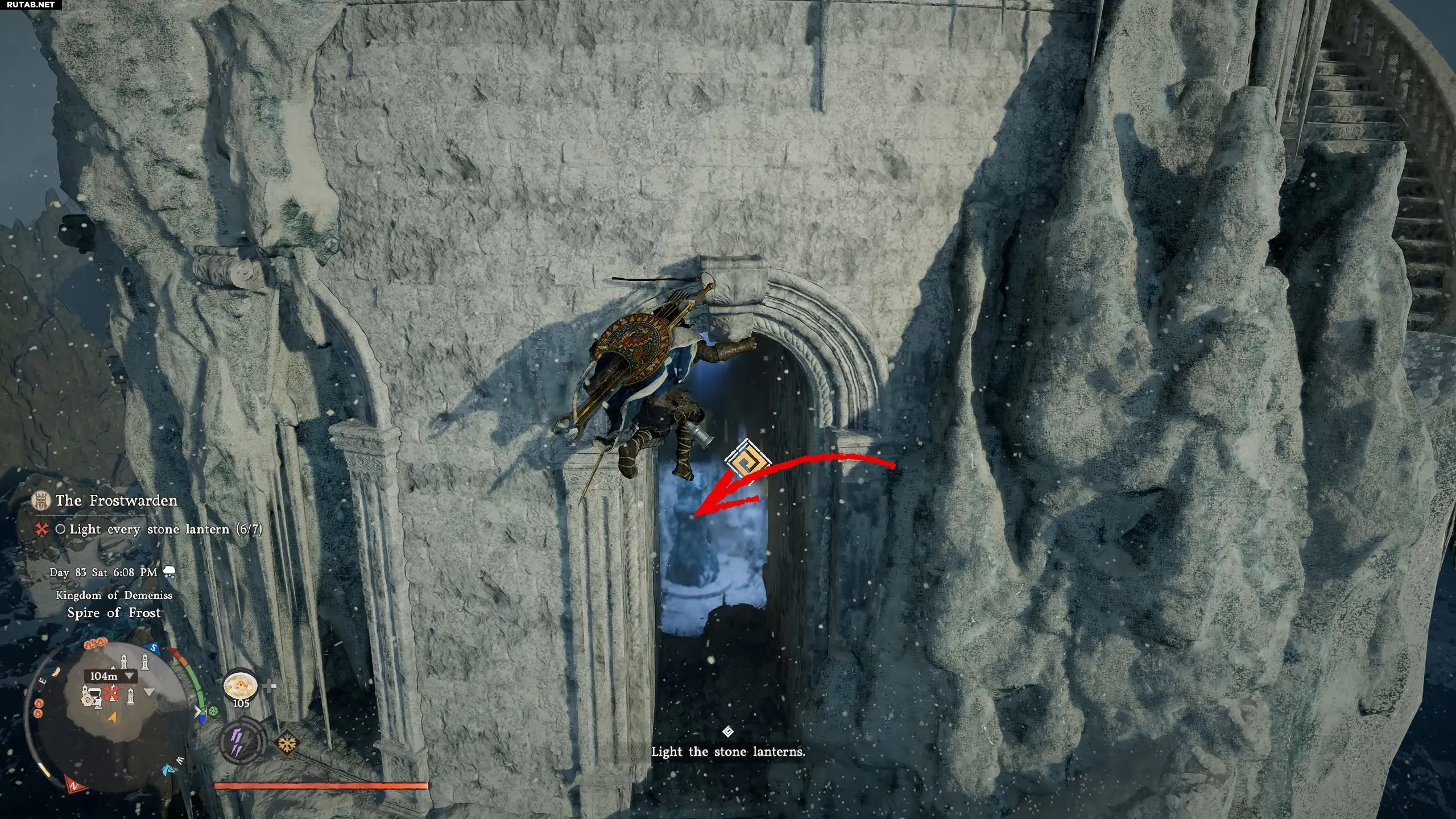 Для седьмого, последнего фонаря вам нужно будет продолжать подниматься по лестнице и снова войти в Шпиль через окно слева. Внутри вы найдете последний каменный фонарь. Его зажжение завершит квест «Хранитель Мороза» в Crimson Desert.