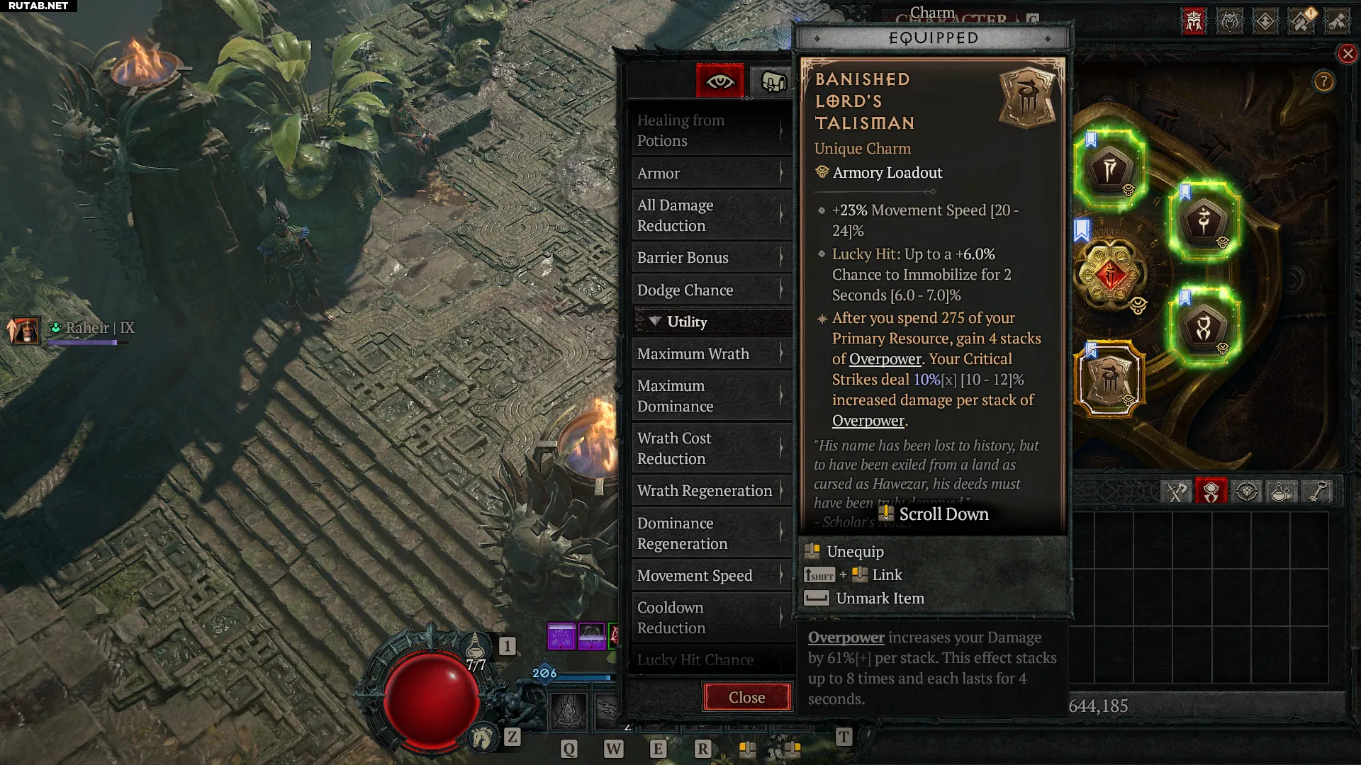 - Экипируйте «Талисман лорда-изгнанника» в шестой слот. Он значительно увеличит ваш урон за каждый стак «Сокрушительного удара».