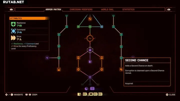 Постоянные улучшения Арджуна открываются через его Броневую матрицу. Хотя выжить в Saros непросто, одна способность может кардинально помочь: «Второй шанс». Название говорит само за себя: один раз за забег вы можете воскреснуть, подобно тому, как это работает в Sekiro: Shadows Die Twice.