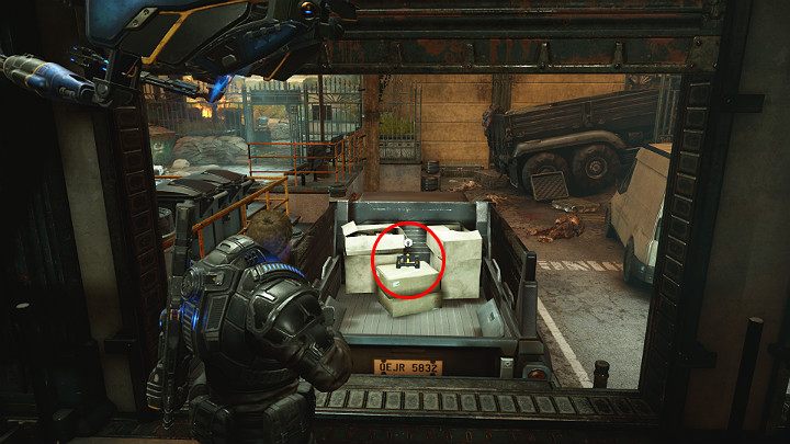 Откройте загрузочные ворота и соберите улучшение, спрятанное в верхней части грузовика. Идите в следующую комнату.
