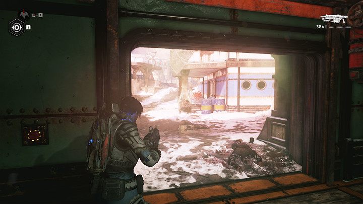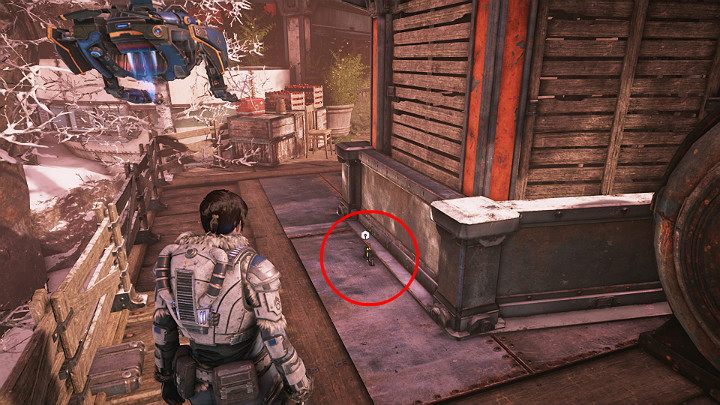 Следующий коллекционный предмет лежит в снегу за большим причудливым рогом - шлем погибшего бойца Коалиции. Пройдите через ворота безопасности и продолжайте движение к паровой ферме.