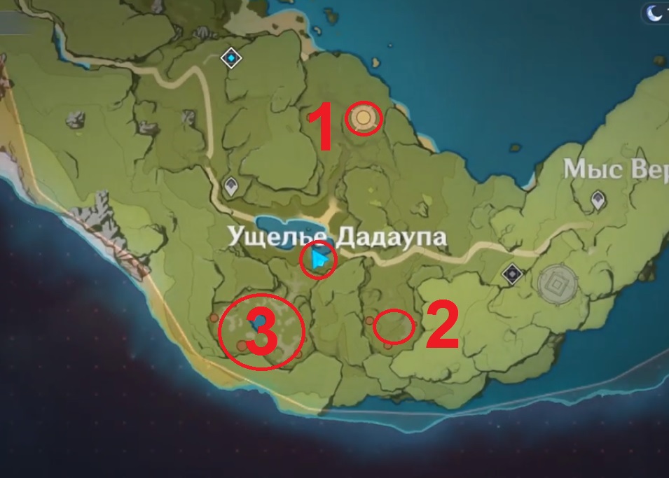 Всего лагерей хиличурлов три – на севере, к югу и к юго-востоку, они отмечены на скриншоте цифрами. Располагается квест вот здесь (отметка кругом без цифры), это Ущелье Дадаупа: