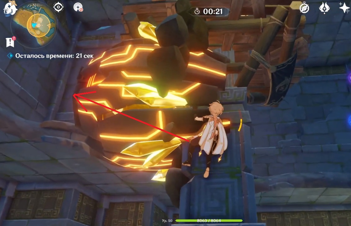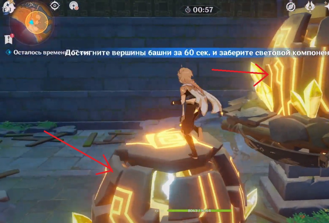 Активируйте испытание и пройдите его. Суть испытания будет заключаться в том, чтобы за 60 секунд забрать световой компонент с высоты над значком испытания. Очень желательно здесь иметь гео-направленность основного героя, чтобы он мог ставить бочонки вот таким вот образом заранее. То есть до активации испытания.