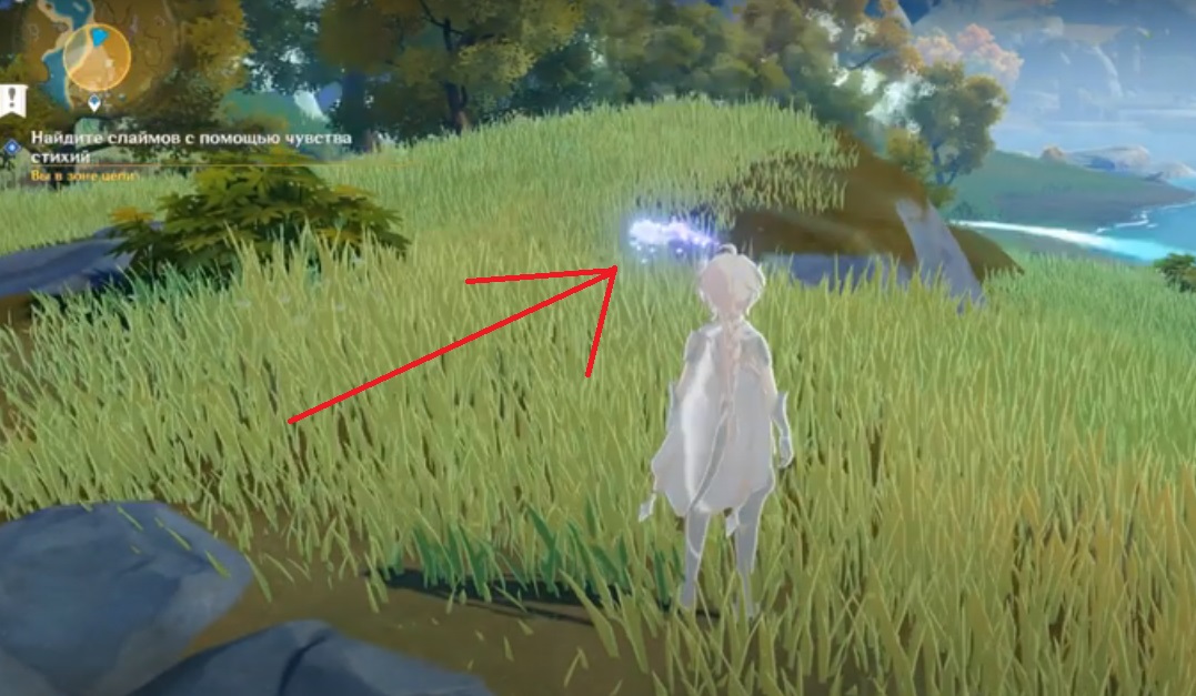 Обращайте внимание на серебристо-синее свечение, это следы слаймов, которых вам нужно обнаружить для продолжения миссии. Бегите на след, который указывает вам путь и периодически активируйте чувство стихии. Если запутатетесь, то просто ориентируйтесь на мини-карту, вам нужно прийти примерно в центр желтой области, чтобы найти слаймов.