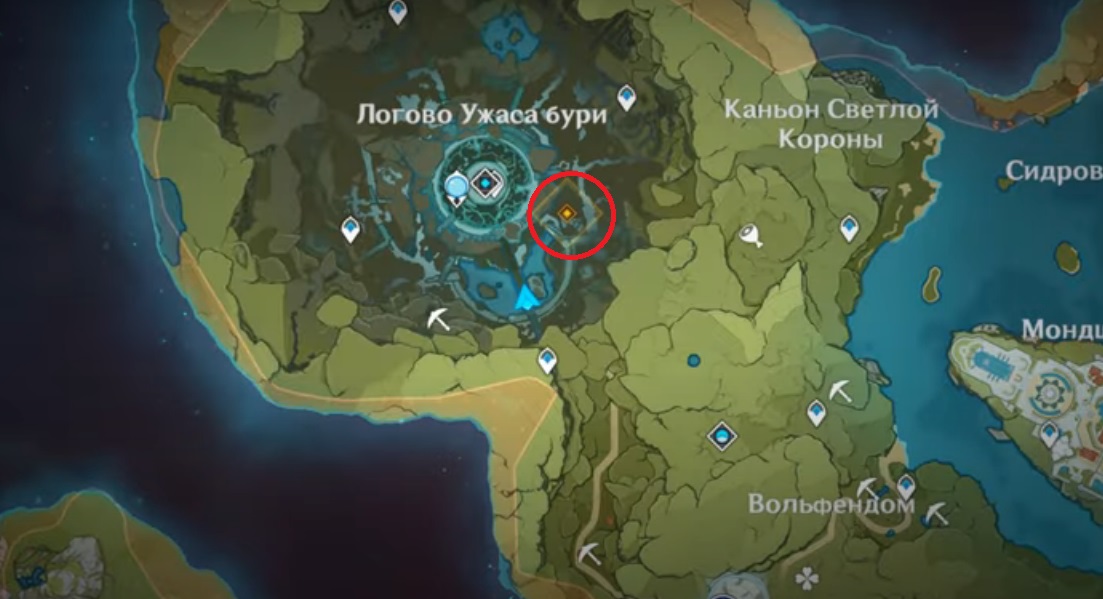 После выбора положите на алтарь выбранный цветок и поговорите с Венти. Паренек предложить поговорить в другом месте, в логове Ужаса Бури. Нужное вам место можно увидеть сразу около телепорта: