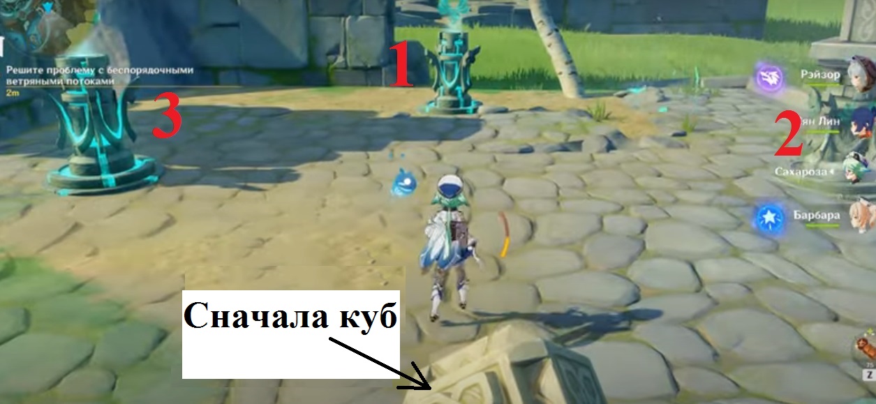 Для этого поставьте в отряд какого-нибудь анемо персонажа (основного героя, Джинн или Сахарозу, например, лучше Сахарозу). Нужно активировать в определенном порядке анемо тотемы, атакуя из анемо способностью (или с руки, если это Сахароза).