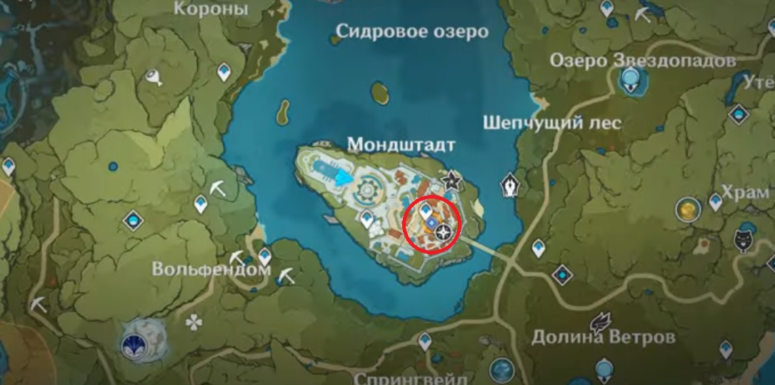 Поговорите с Лили и отправляйтесь в торговый район Мондштадта. Он находится здесь: