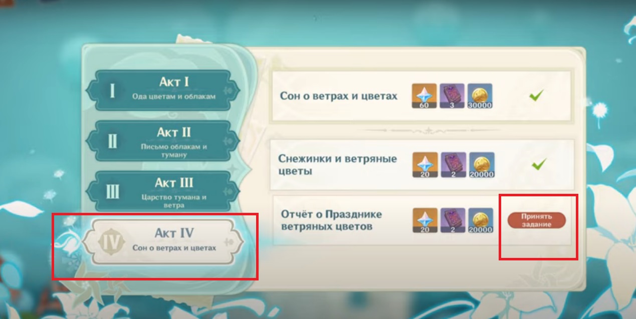 Последняя и финальная миссия, за выполнение которой вы получите 20 примогемов, 2 книжечки для прокачки любого героя в отряде и 20 000 моры. Снова зайдите в раздел событий и нажмите «Приглашение ветряных цветов», после чего выберите «Праздничные предания» и найдите последнюю миссию Акта 4.