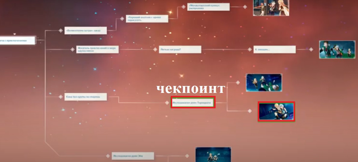 Например, на скриншоте ниже вы увидите рисунки с цифрами – это финал. Обычные квадратики – это чекпоинты, вернувшись на которые можно переиграть решения или ответы, после чего сюжет пойдет по новому пути и вы откроете новую концовку.