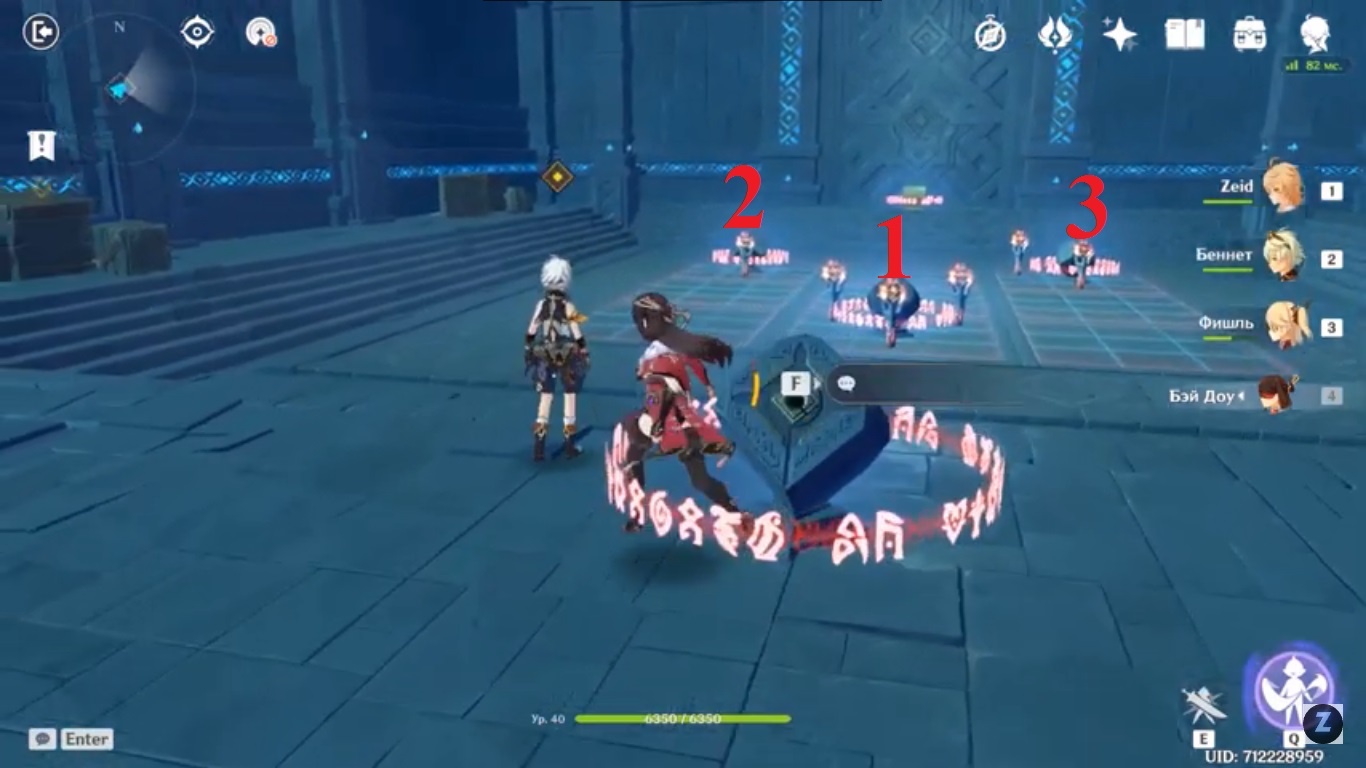Сначала вы увидите 2 куба, которые нужно активировать одновременно с Беннетом. Вы с этим справитесь и попадаете во вторую комнату со сложным секретом руин Эйа.