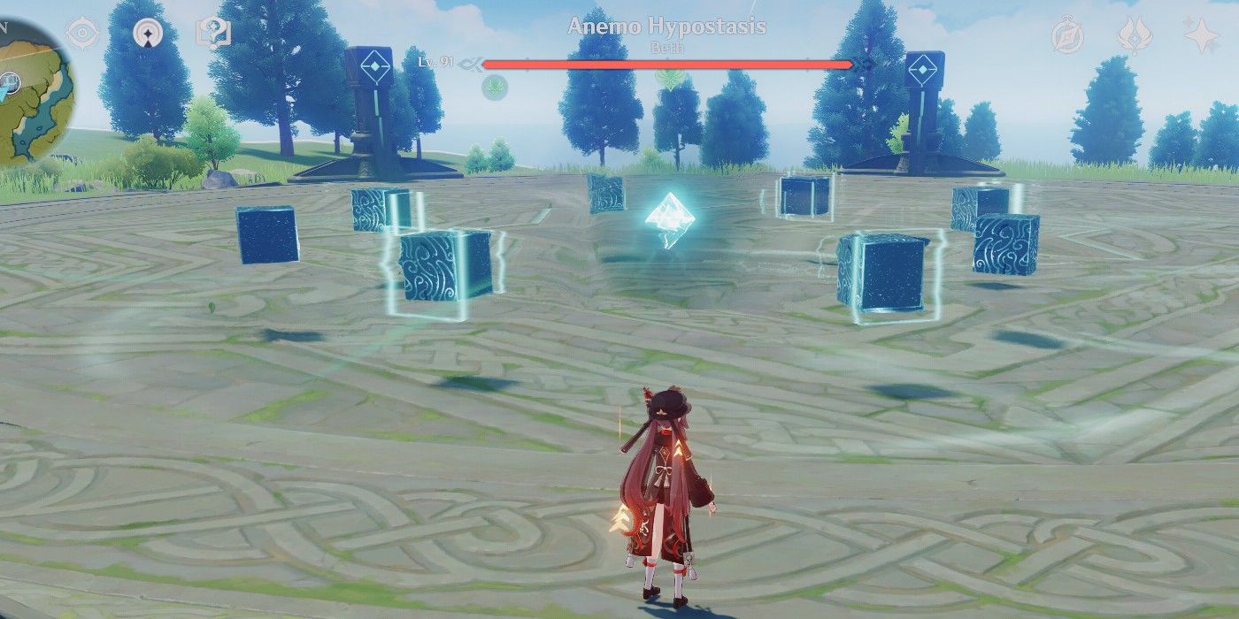 Анемо Гипостазис - босс, находящийся в районе Мондштад, в горах Буревестника. Находится он в ареноподобной круговой структуре, и выглядит как огромный куб со светящимся в центре ядром. Он не получает урона, если защищен барьером, и, надо ждать, пока он оголит своё ядро.