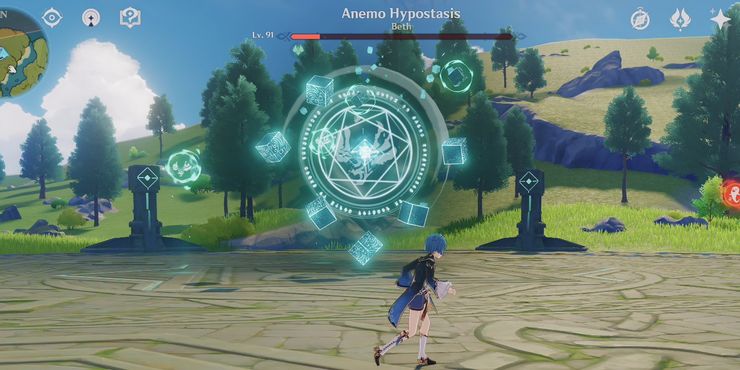 - Второе дыхание. При низком уровне здоровья перемещается к центру арены и образует четыре больших летающих шара вместе с восходящими потоками. Через некоторое время поглощает все анемо сферы, восстанавливая себе большую часть здоровья. Поглощайте с помощью потоков сферы, чтобы не дасть восстановить здоровье. К тому же, поглощенные сферы не возрождаются второй раз, поэтому постарайтесь собрать максимум, чтобы он не лечился снова.