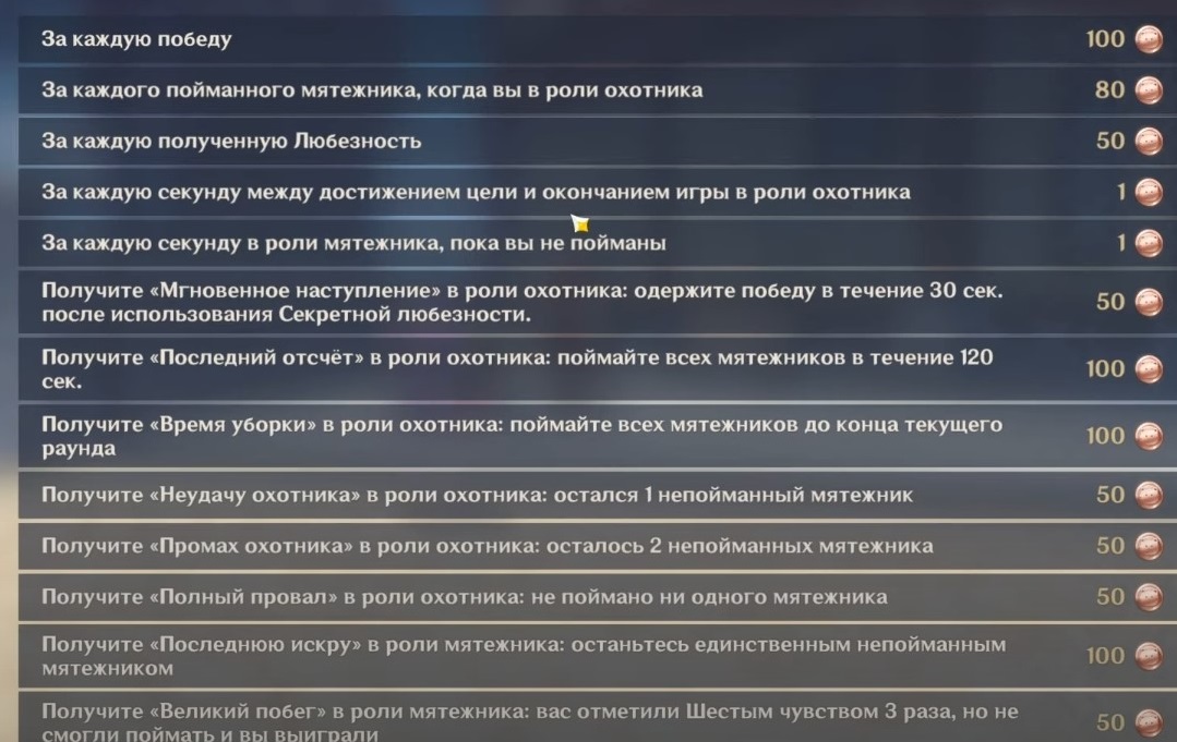 Также можно получать в награду мору 50 000 единиц, если выполнять различные условия во время игры. Например, «получить любезность 1 раз», «найти 5 мятежников, используя ауру» и так далее.