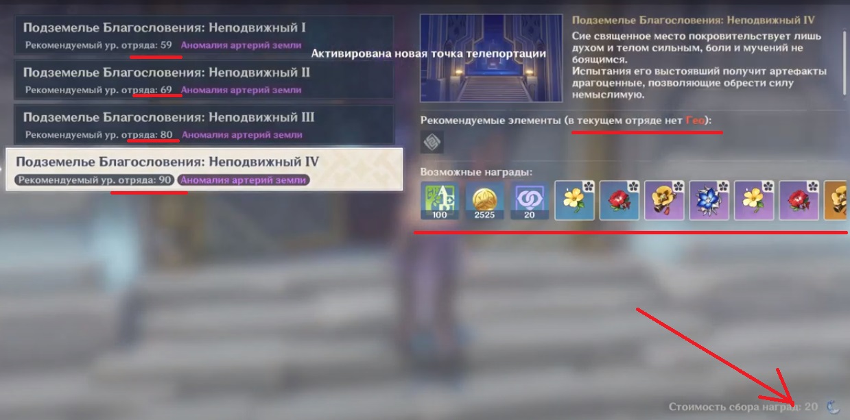 Для первого уровня вам понадобится 59 лвл отряда, для второго 69, для третьего 80 и для четвертого 90 лвл для отряда. При этом вам очень понадобится гео герой (например, Чжун Ли, Альбедо или Ноэлль, если играете через дополнительные щиты и отхил), будьте готовы к тому, что битва будет тяжелой. Особенно на последних уровнях. На начальных уровнях подземелья вы можете справиться и без гео героя при грамотной сборке