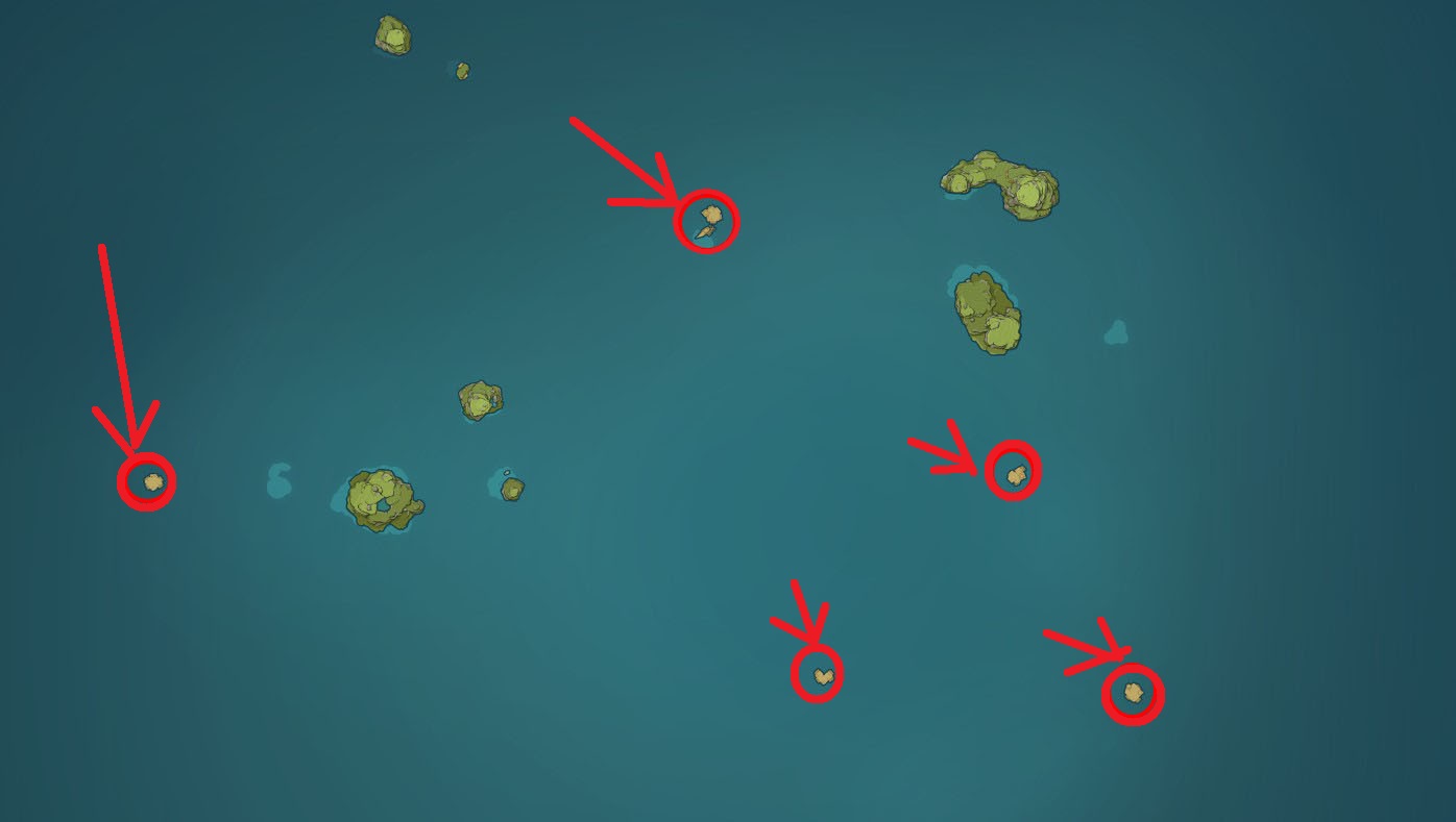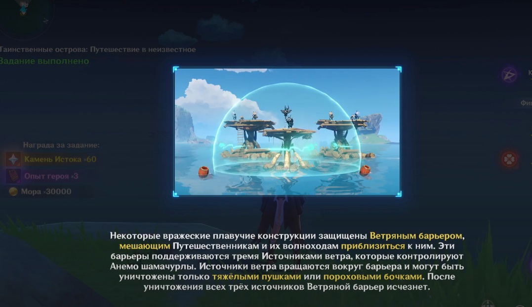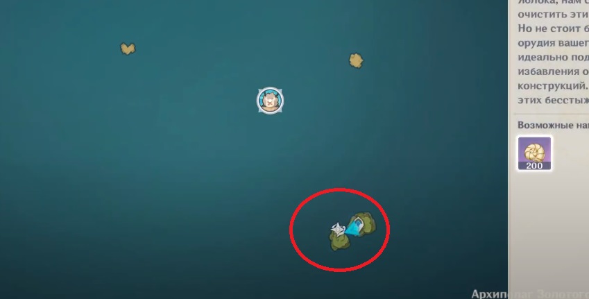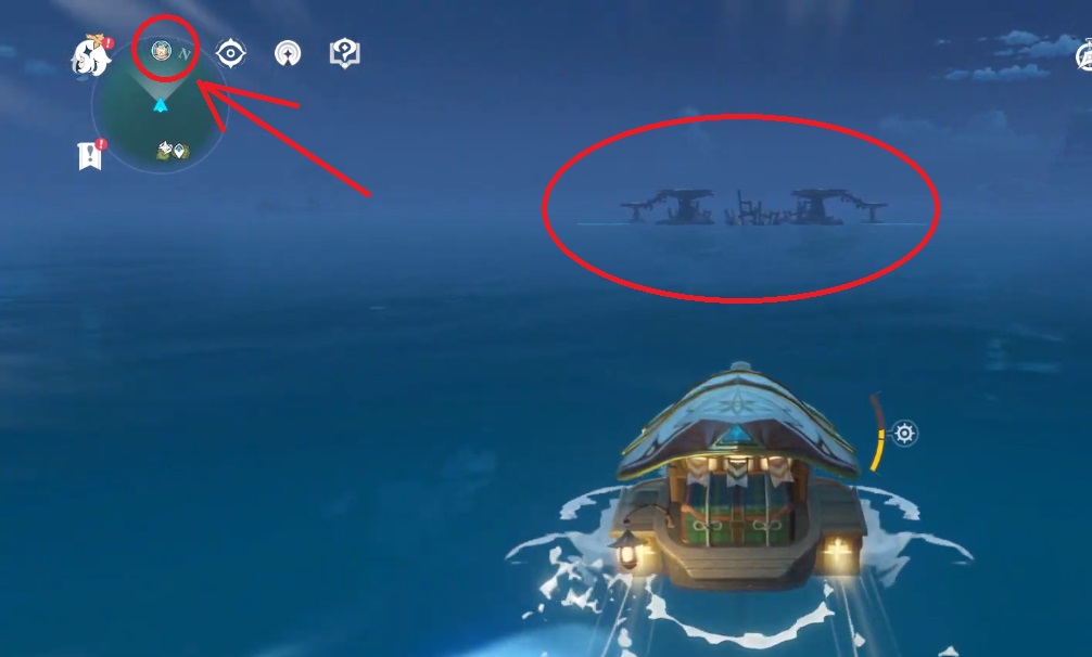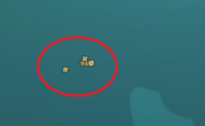 На карте мира оно отображается иконкой с хиличурлом и выглядит как множество рядом стоящих плавающих построек, которые нужно разбомбить. Как только вы подплывете ближе, на мини-карте появится желтая выделенная область и сигнал с заданием «уничтожьте всех врагов».