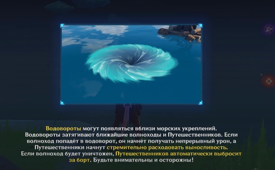 Но и это ещё не все преграды на морском пути. Вы также будете встречать водовороты, в которые категорически не рекомендуется попадать. Встречаться они будут вблизи сооружений хиличурлов. Если вы попадете в ловушку из водоворота, ваше судно начнет очень быстро терять здоровье, а герои будут активно расходовать энергию: