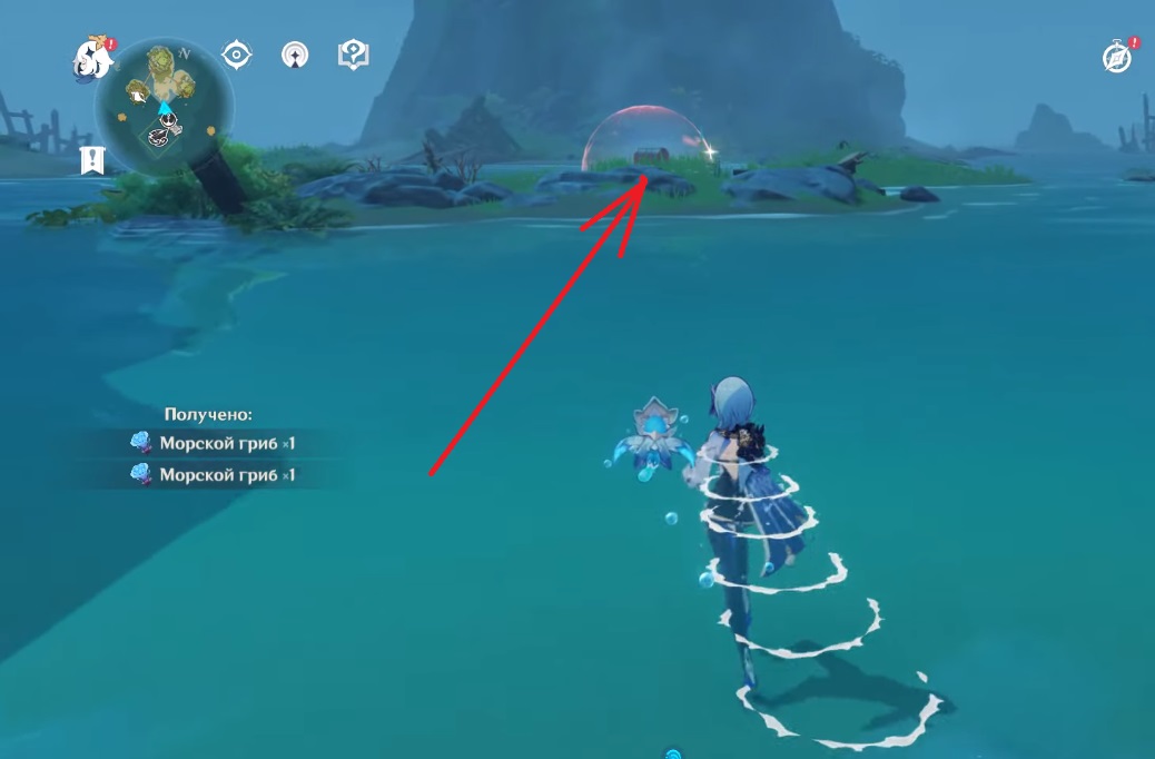Активируйте телепорт на ближайшем острове (а заодно соберите морские грибы), после чего подойдите ближе к «строенным» островам, на которых вы увидите сундук под куполом и защитой: