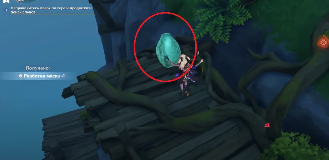 Тем временем задание обновится до «поиски следов». Взберитесь на одну из гор, например, на центральную, где вас встретят пиро и обычные хиличурлы. Кстати, чтобы вам было проще взбираться, по пути можно разбиваться вот такие голубые яйца, которые активируют воздушный поток: