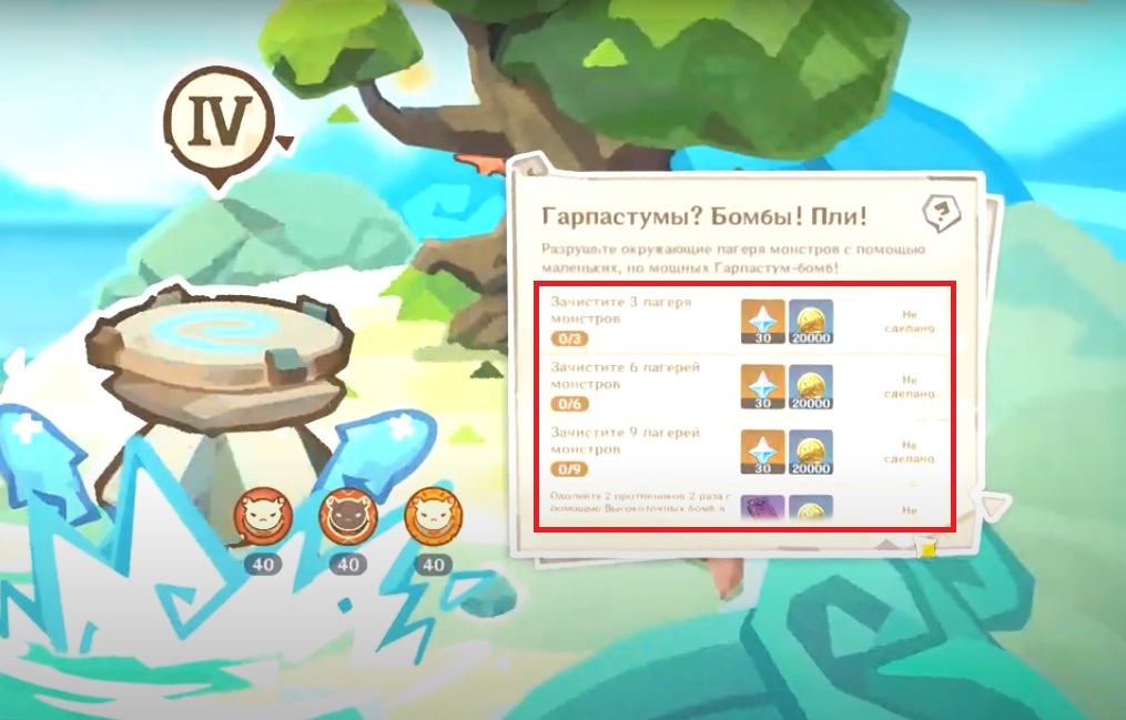 Когда вы нажмете на четвертый объект, откроется меню наград с условиями их выполнения. За зачистку лагерей от монстров вы будете получать по 30 примогемов и сверху мору, за дальнейшие задания в награду пойдут только книжечки с опытом для героев и мора.