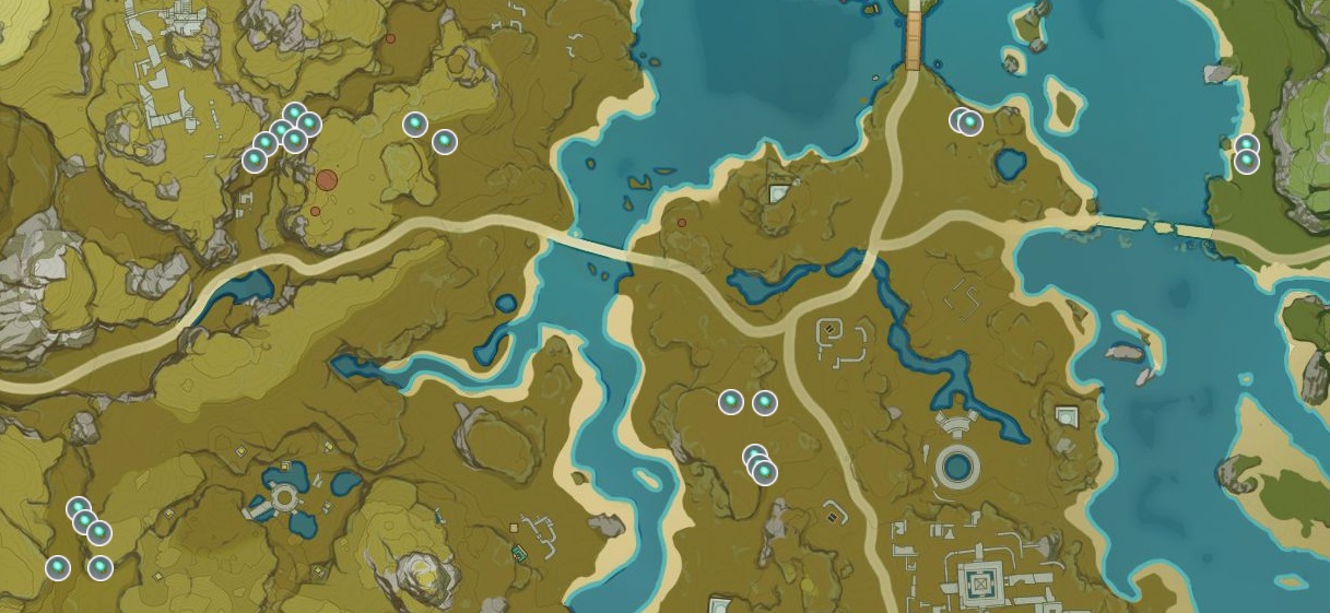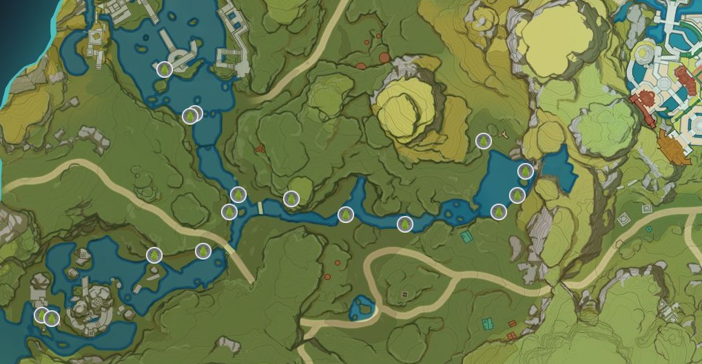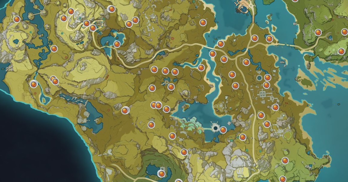 Если скриншотов вам показалось недостаточно, вы можете воспользоваться официальной интерактивной картой, где точно сможете посмотреть расположение каждого нужного вам ресурса. Это очень удобно, потому что вы сможете увеличивать изображение и отслеживать максимально точное местоположение ингредиентов, а также фильтровать их в меню слева. Выберите «Тейват» и ниже выберите нужный вам ингредиент.