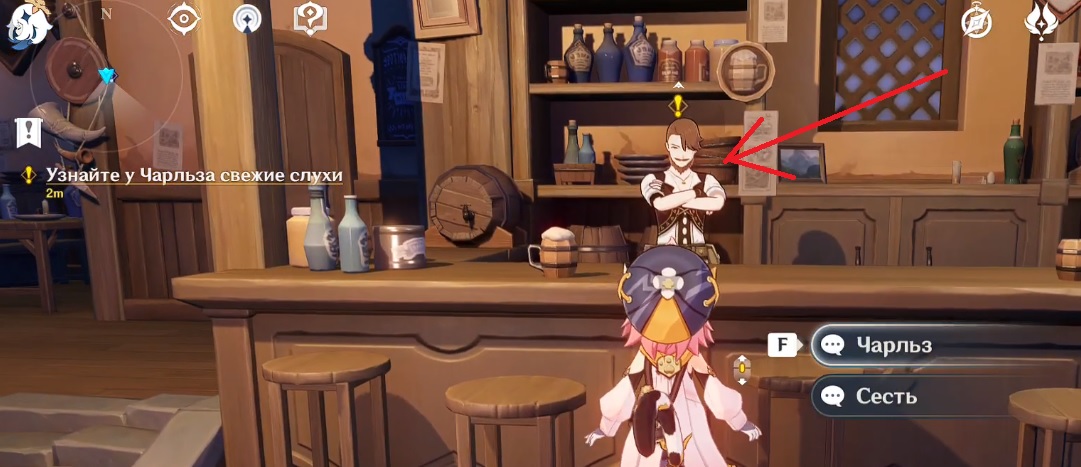 Старт миссии начинается в таверне Дилюка, вам нужно поговорить с Чарльзом. Это бармен, он стоит прямо напротив входа. Вы узнаете нужную вам таверну по человеку, который будет стоять у входа, его зовут Паттон.