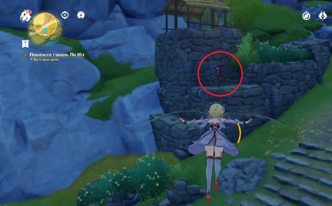 После телепортации появится желтая область для обследования, в ней вам нужно найти Мону – она будет стоять на камнях сразу недалеко от телепорта. Когда вы подойдете, запустится кат-сцена, девушка уже давно вас ждет и попросит пойти за ней: