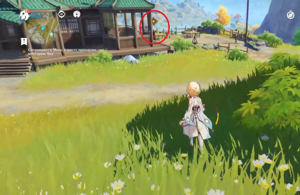 Но перед тем, как выдвигаться, Мона захочет попрощаться с мистером Чжу, это недалеко от гор Тяньхэн. А вот и он, просто бегите на метку, тут совсем рядом: