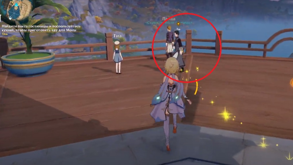 Вы также узнаете, что Мона не ест еду, приготовленную за мору. Поэтому вам нужно приготовить ей блюдо бесплатно. Это будет золотистый краб, рецепт на него вам выдаст сам хозяин Ваншу. Вам нужно лишь попросить одолжить кухню у владельца двора, его зовут Хуай Ань, это он: