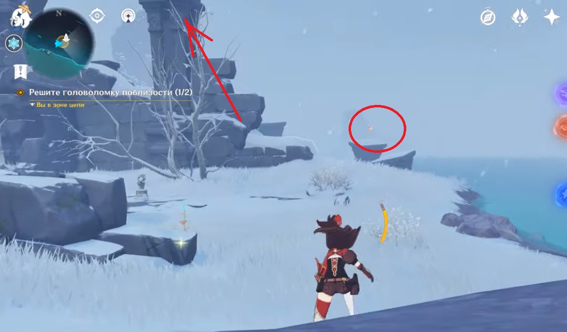 Или просто взберитесь на гору самостоятельно. На месте вас будет ждать Альбедо. Суть следующего опыта будет заключаться в ваших физических особенностях. Теперь нужно пролететь со снежной горы вниз по воздушным кольцам до соседнего «берега» застывшего озера.