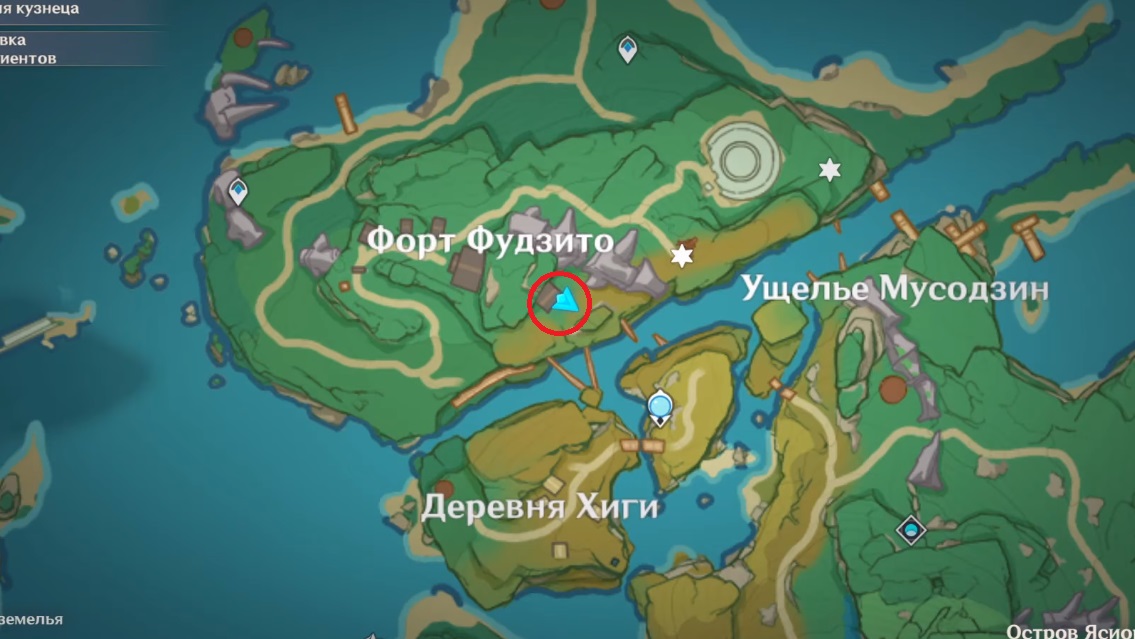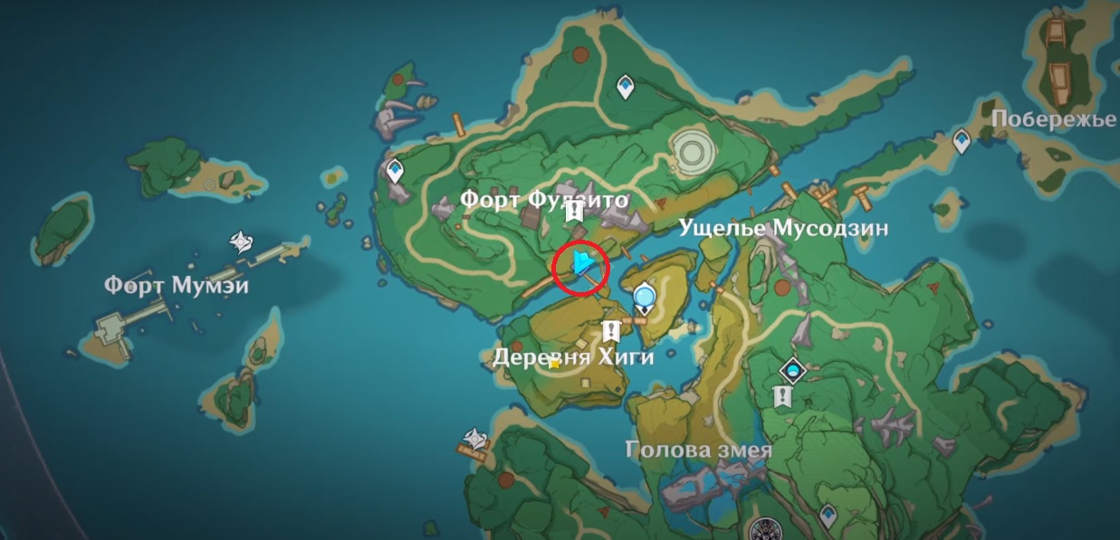 Если все условия выполняются, и вы готовы стартовать квест, вам необходимо попасть на островок «Форд Фудзито» на крупном острове Ясиори, на место недалеко от статуи архонта. Вот здесь это место: