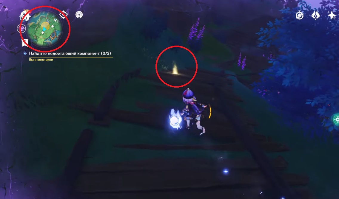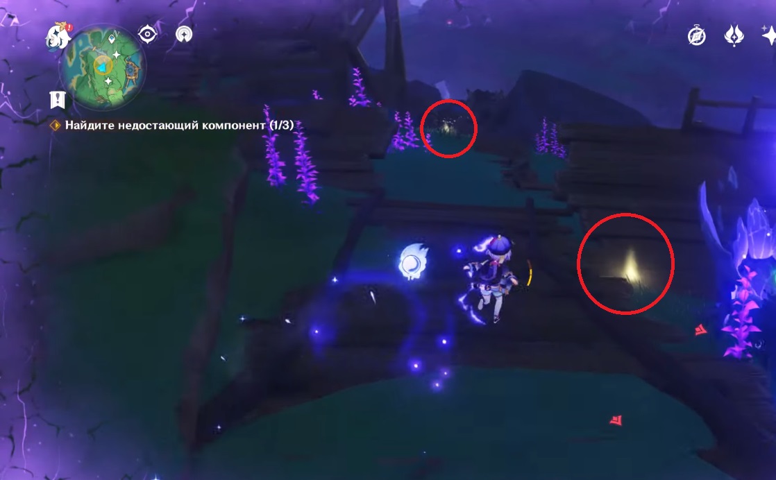 После ещё одной проверки устройства вы узнаете, что не хватает ещё трёх компонентов. Без них устройство всё равно работает, они не ключевые, но их всё равно придется установить, чтобы без проблем продвигать к горну. Все недостающие компоненты вы найдете по пути к устройству, в желтой выделенной области. Первый компонент будет лежать совсем рядом, обратите внимание на мини-карту: