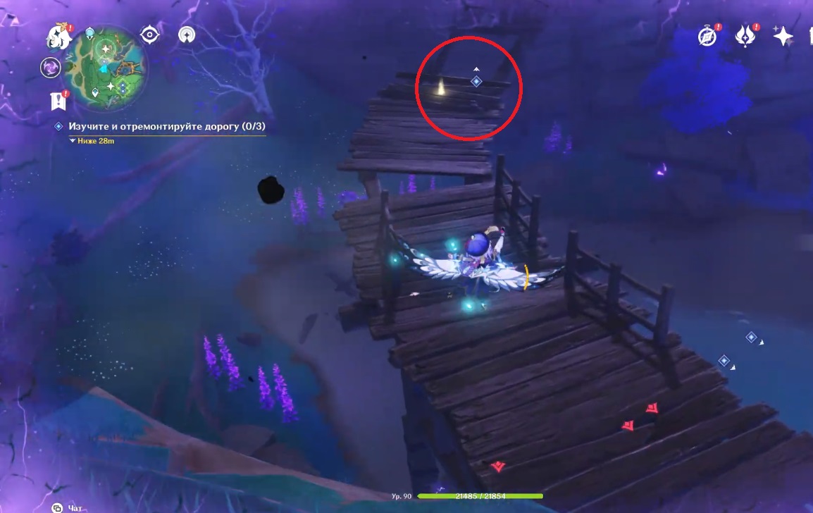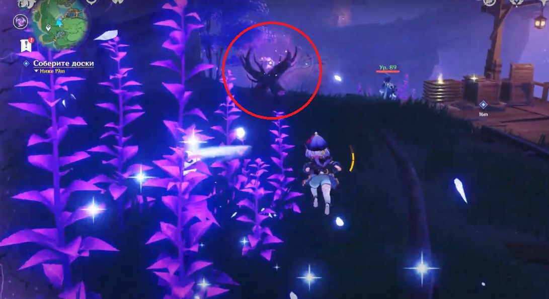 Подойдите к сияющей желтым светом метке на деревянных ящиках и досках и нажмите на F, чтобы собрать необходимый материал. Рядом будут ходить фатуи, вам не обязательно сражаться. Также не забывайте, что вокруг активируется аномальная зона с электро, а это значит, что ваш экран покроется фиолетовой дымкой и герои начнут получать урон. Соберите электро гаргантум, чтобы избежать неприятностей: