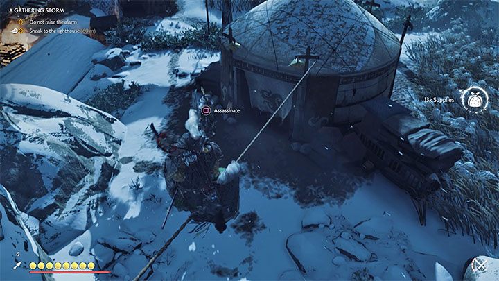 Противники из лагеря также могут быть атакованы сзади, или можете просто проскользнуть мимо них - последний вариант требует, чтобы вы шли вдоль линии свисания, ведущей к крыше палатки.