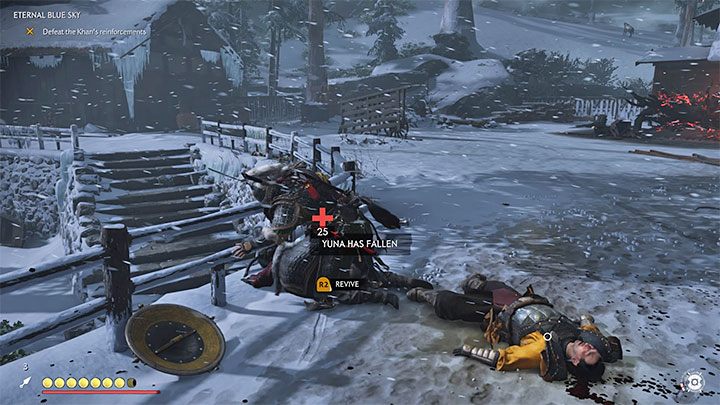 Во время боя возникает ситуация, когда Юна падает и начинает кровоточить. Теперь вот что вы должны сделать - быстро избавиться от ближайших врагов или использовать дымовую бомбу, чтобы отвлечь их, а затем приблизиться к Юне как можно быстрее и оживить её.