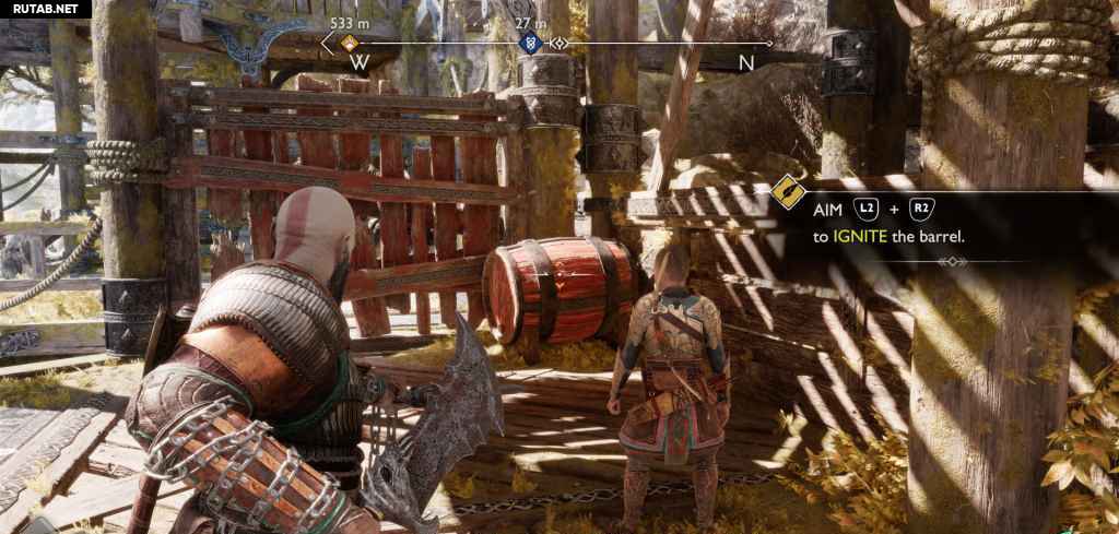 Пройдите через область и заберитесь на платформу, где вы можете открыть ярлык для начала и открыть ворота к другой бочке, которую вы можете разрушить, открывая больше путей.