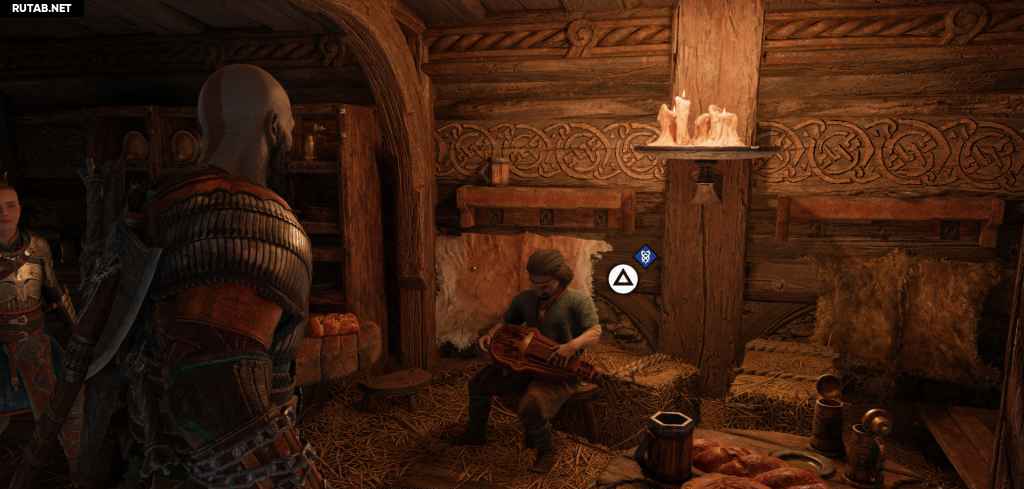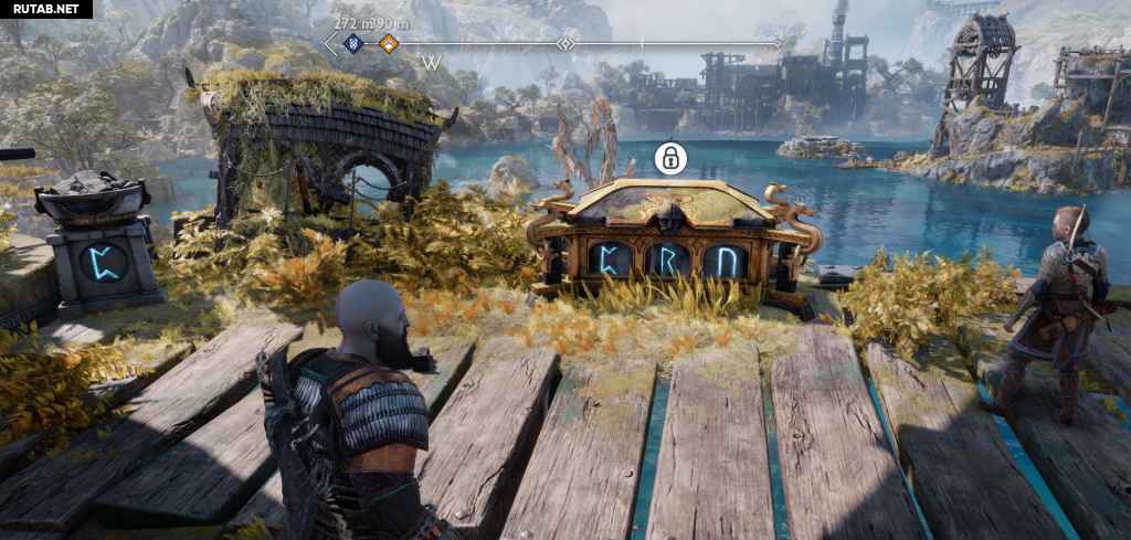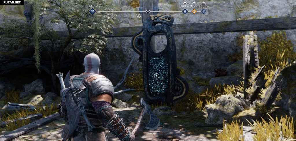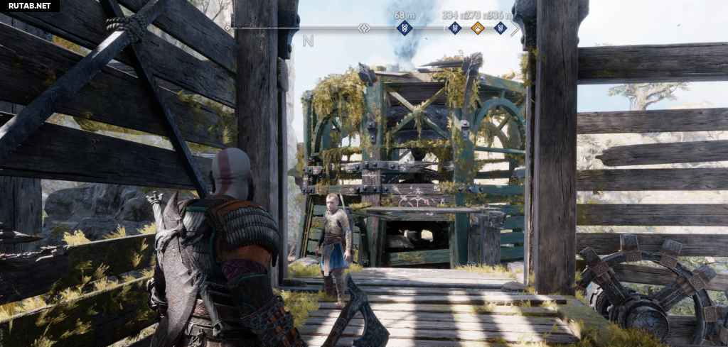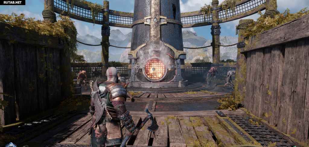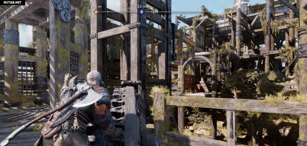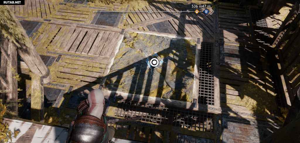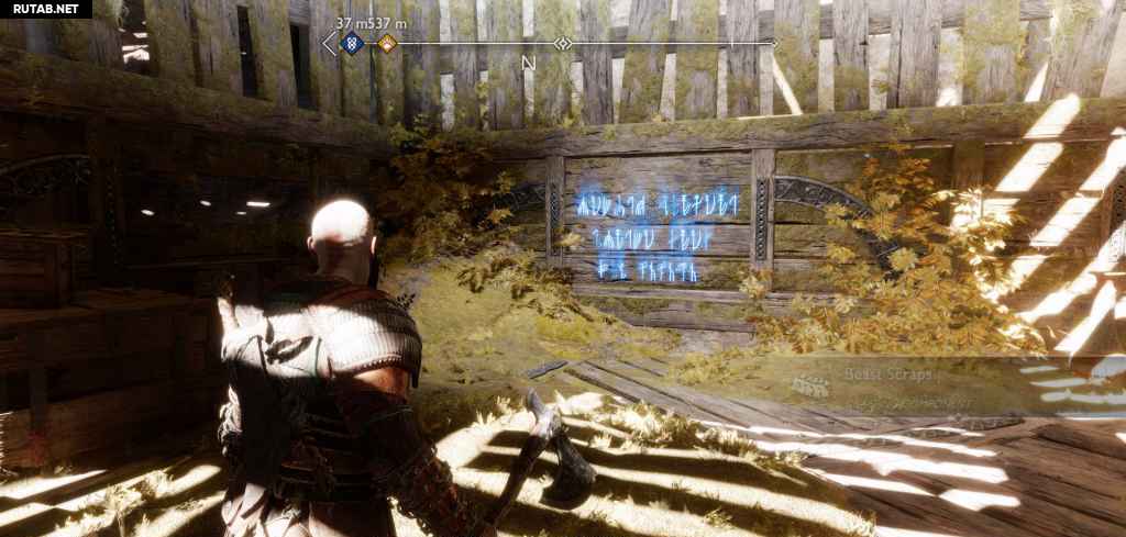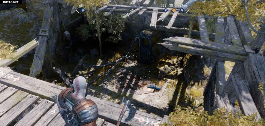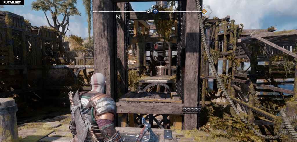 Пройдите через только что открывшуюся дорожку налево и обойдите стену, затем спрыгните вниз, чтобы разбить пол внизу. Разберитесь с драуграми и прочтите руну, прочитанную на стене. Используйте лезвия, чтобы поднять подъемник обратно, затем верните колесо, поднимите раму.