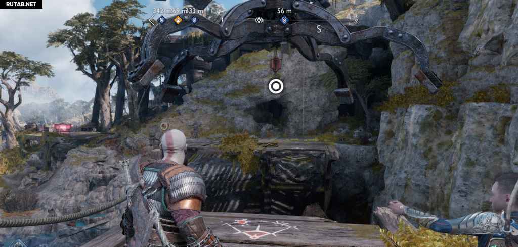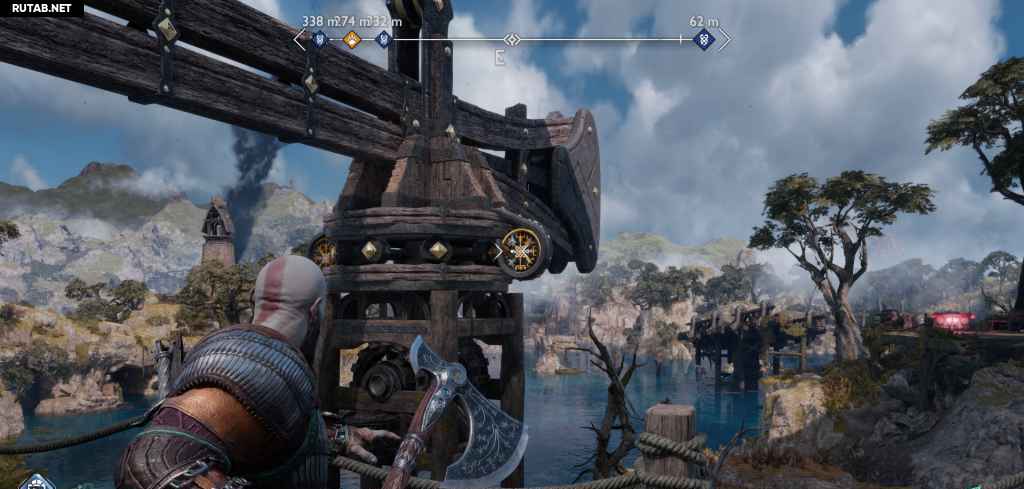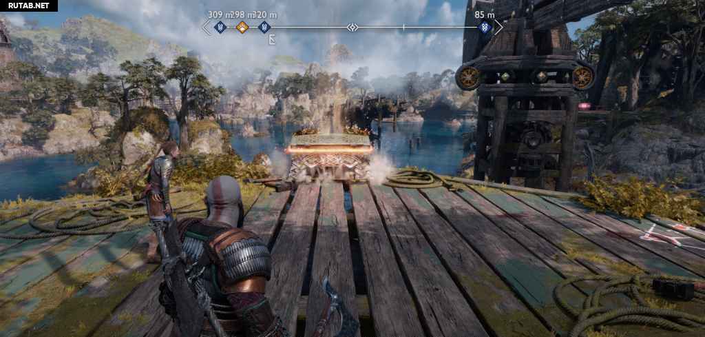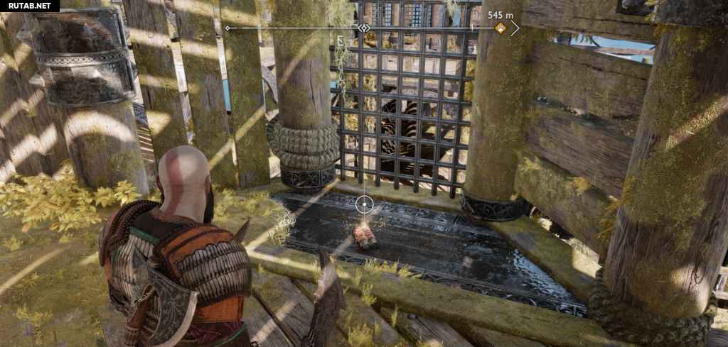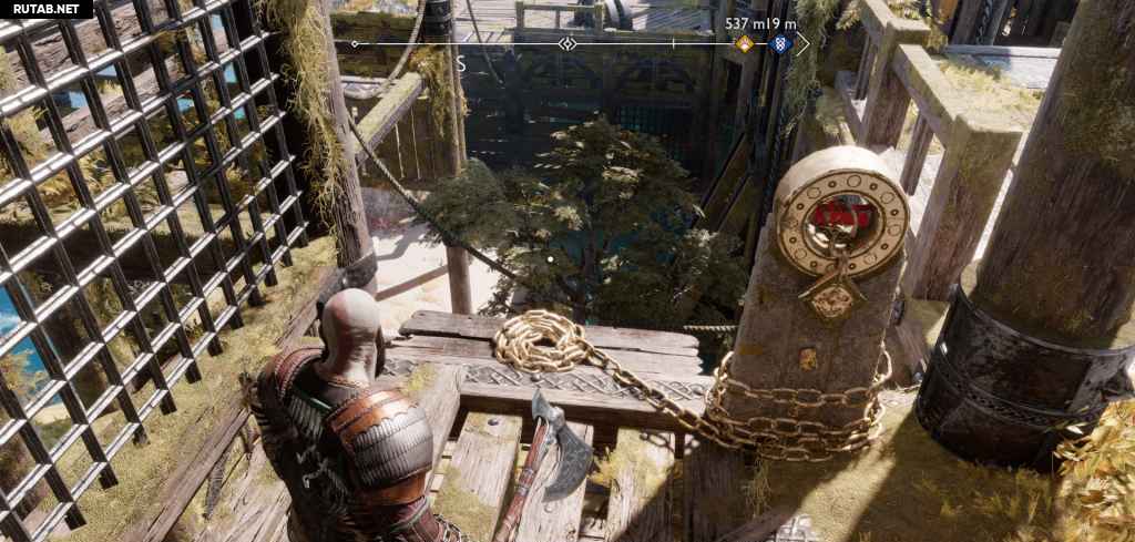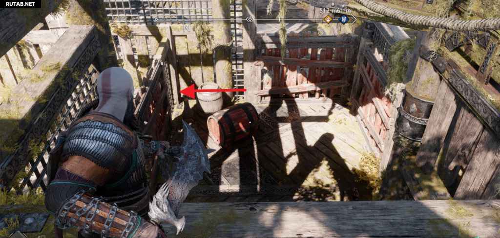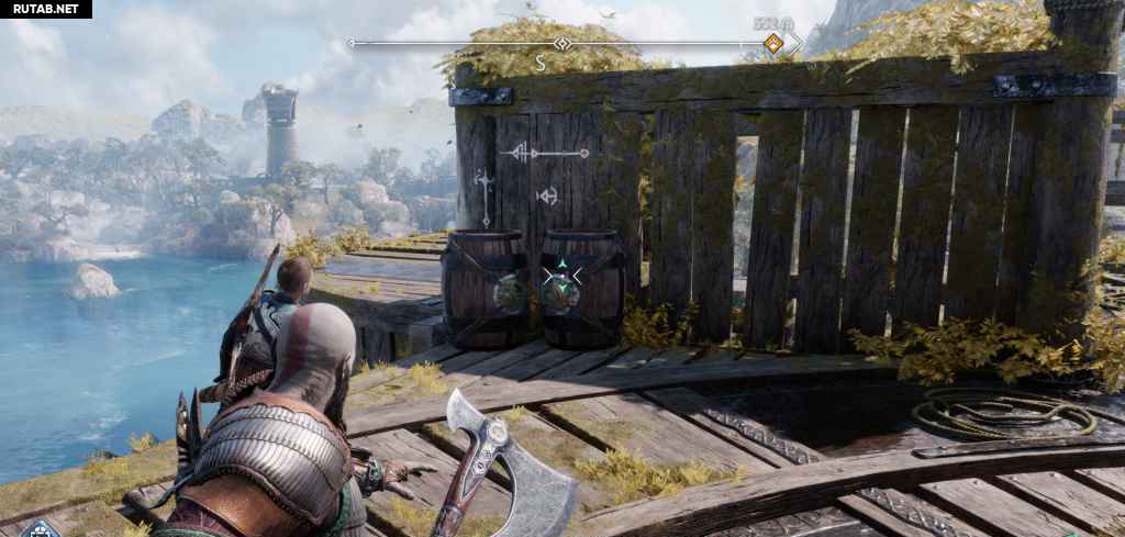 Пока вы здесь, вы можете собрать еще несколько предметов коллекционирования. В углу есть несколько бочек, которые Атрей может разрушить, что позволит вам перебраться к другому короткому пути. Опустите его и спуститесь к колесу, чтобы поднять платформу, затем вернитесь и повернитесь, чтобы сломать стену.
