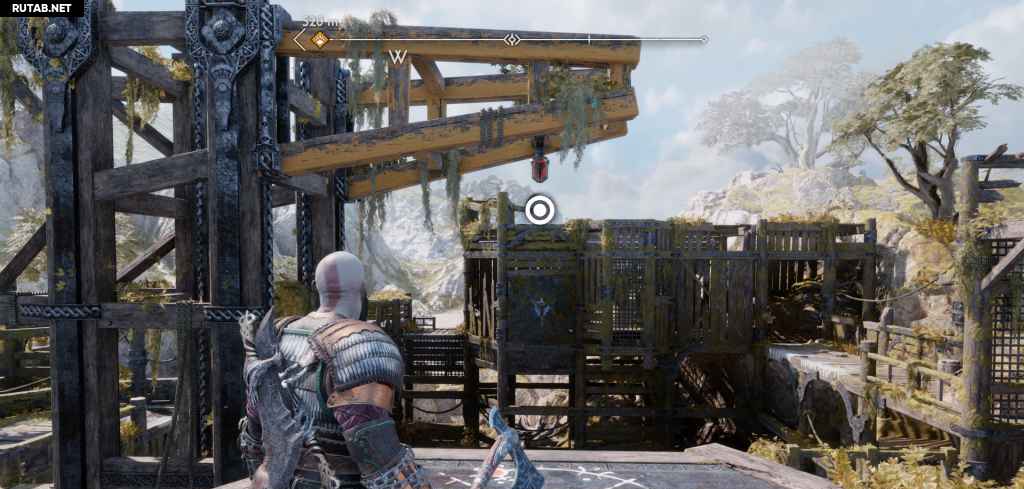 Поднимитесь наверх, затем бросьте свой топор в правый переключатель на кране, чтобы повернуть его, чтобы вы могли пересечь следующую брешь.