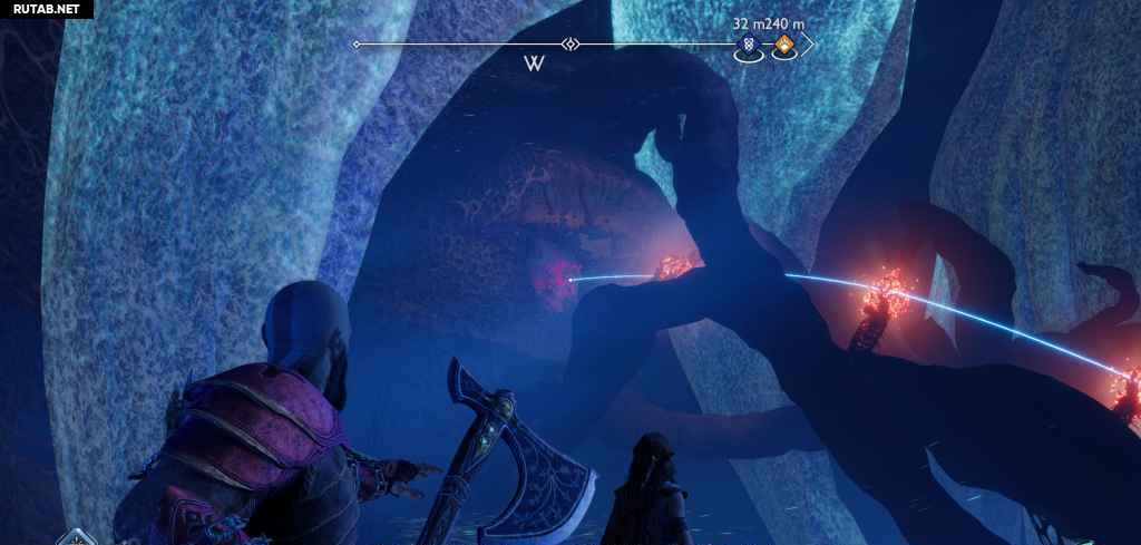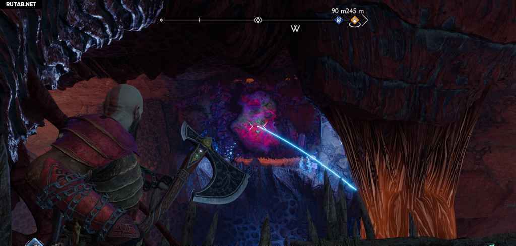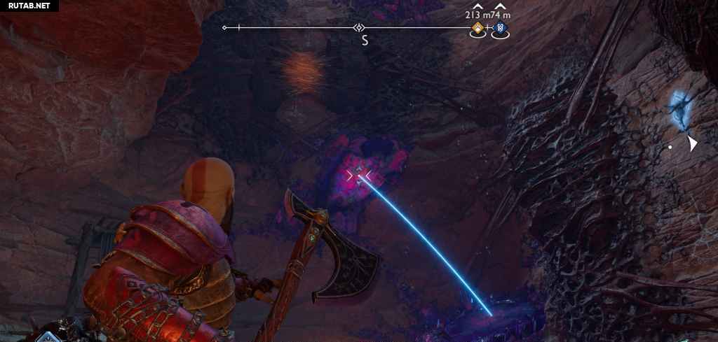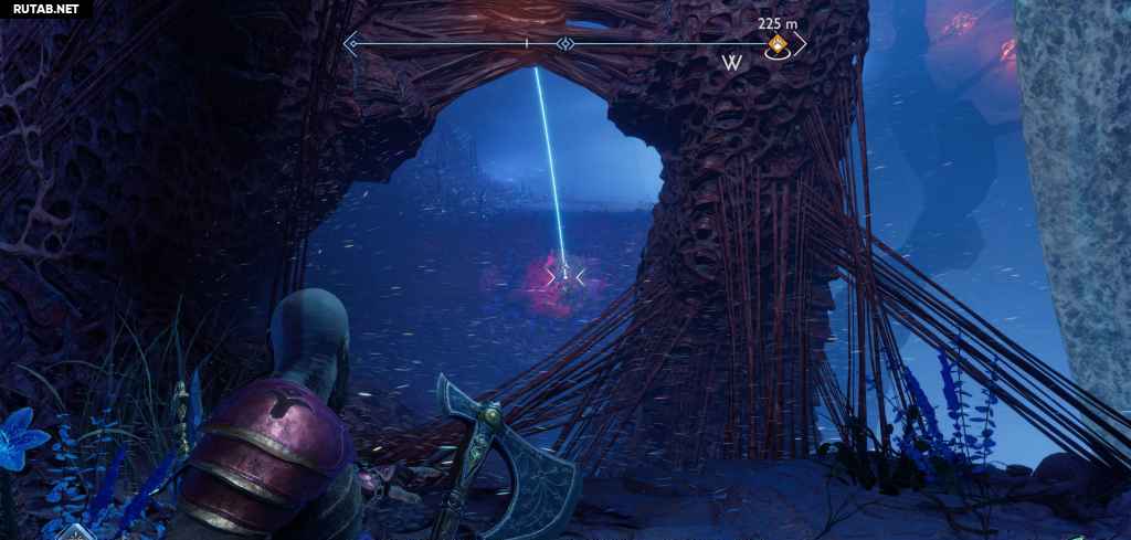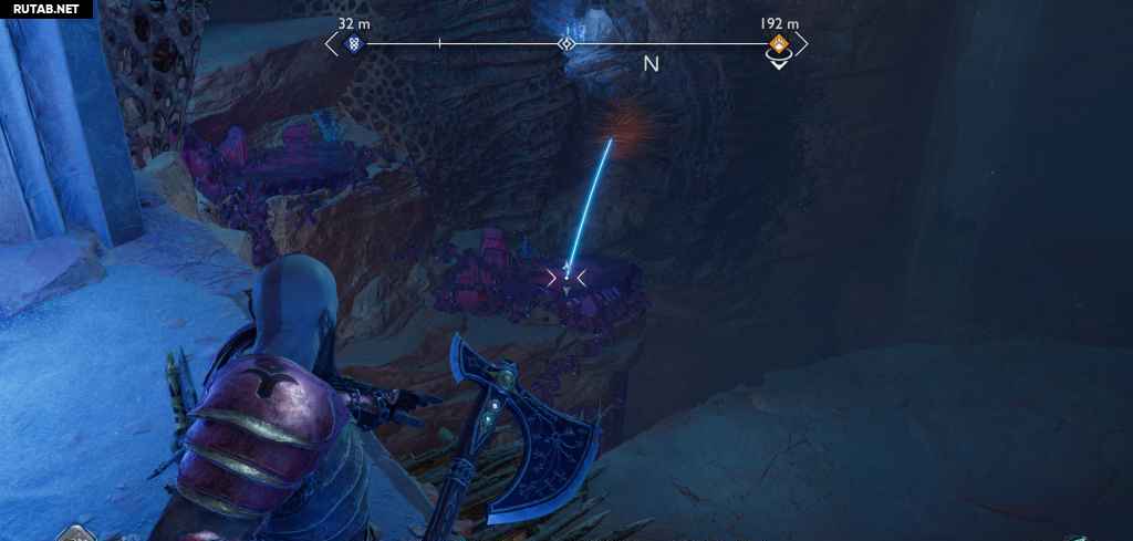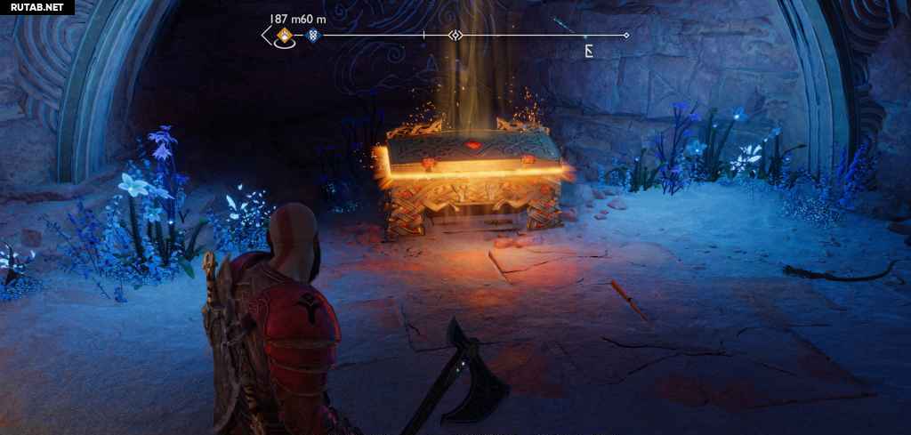 Очистите еще одну комнату от гримов и светлых эльфов, затем заберитесь на стену. Прежде чем продолжить, развернитесь и бросьте топор, чтобы уничтожить какую-то плотную материю улья, и взберитесь по этой стене, чтобы найти легендарный сундук.