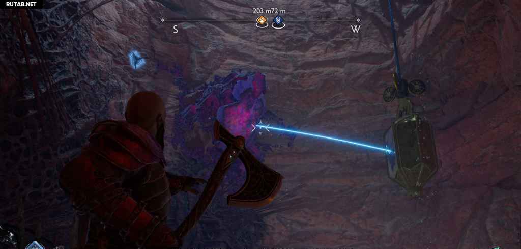 Продолжайте цепляться через область, пока не доберетесь до плотного материала улья, который можно сломать, ударив топором по кристаллу.