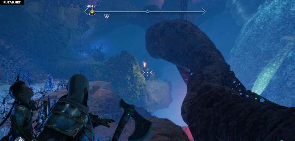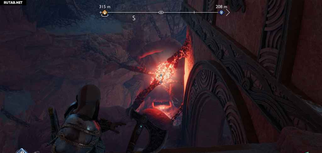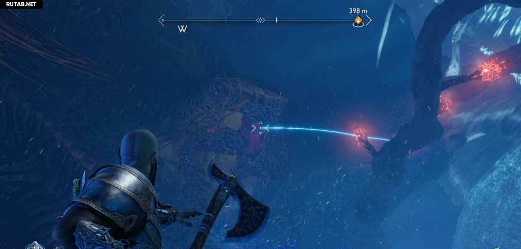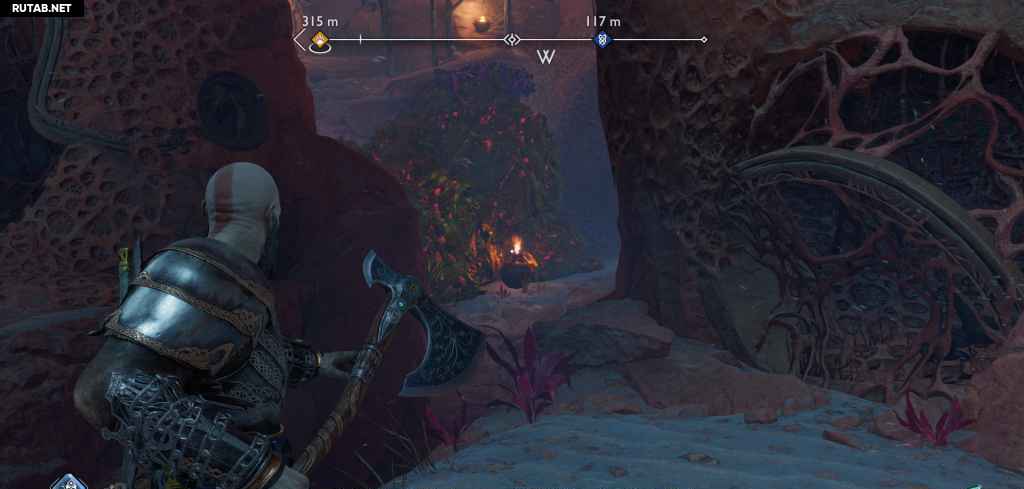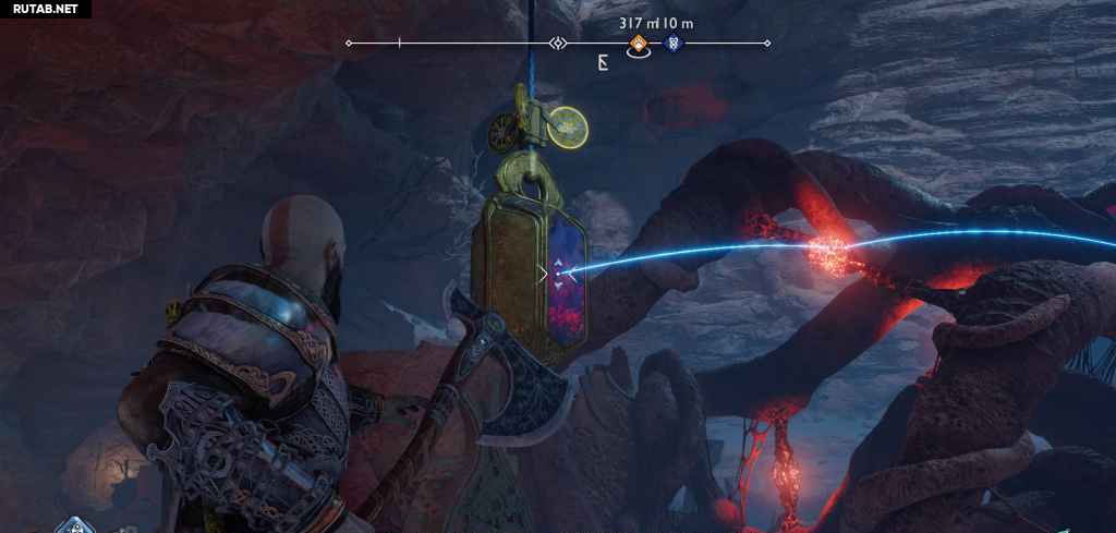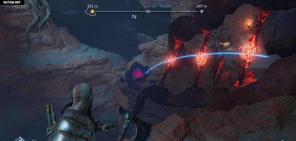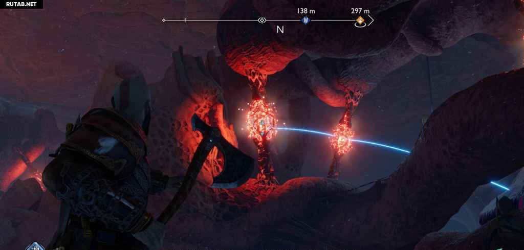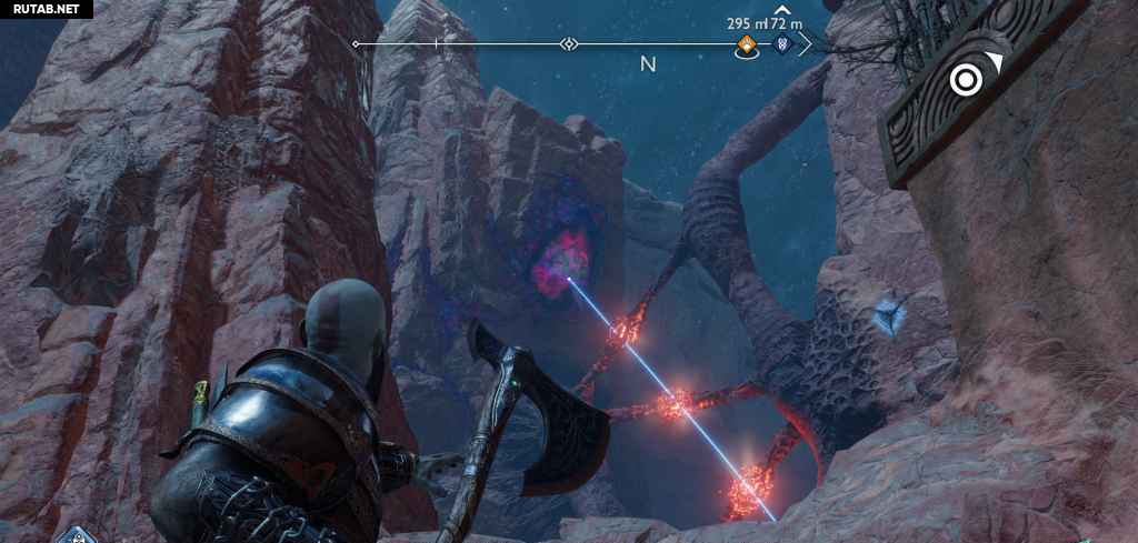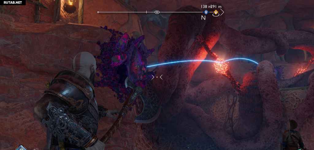 Поднимитесь обратно и продолжайте движение по тросу и цепляйтесь за стены. Спрыгните туда, где находится сундук Норн, и откройте ярлык, но пока игнорируйте сундук, так как вам нужно будет сначала открыть другие ворота, чтобы продолжить. Бросьте свой топор в фиолетовый кристалл, чтобы очистить улей, затем заберитесь обратно и проберитесь сквозь него.